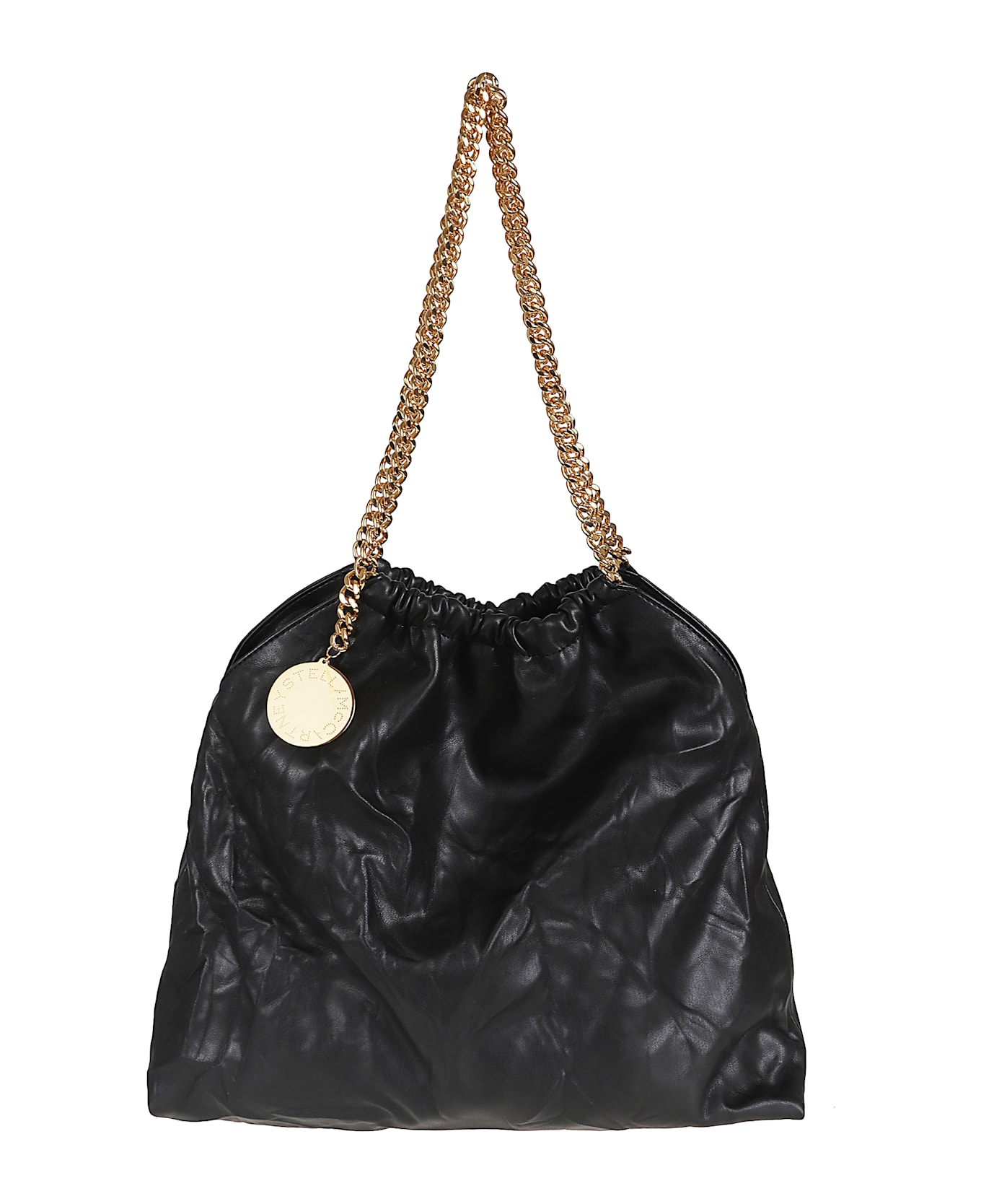 Falabella tote bag, a new interpretation by STELLA McCARTNEY. One main compartment and one interior zip pocket; magnetic snap closure; two top handles; signature diamond-effect chain in recycled brass and aluminum. Features a gold-engraved logo medallion charm.