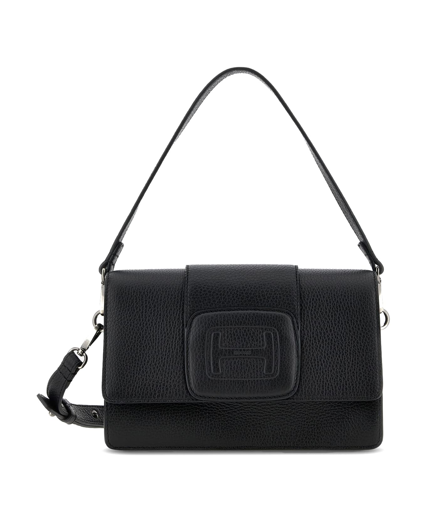 H-Bag crossbody bag in grained leather, black colour. Interior with double gusseted compartment. Removable handle, adjustable and removable shoulder strap. Size: 23,5 x 15 x 10,5 cm