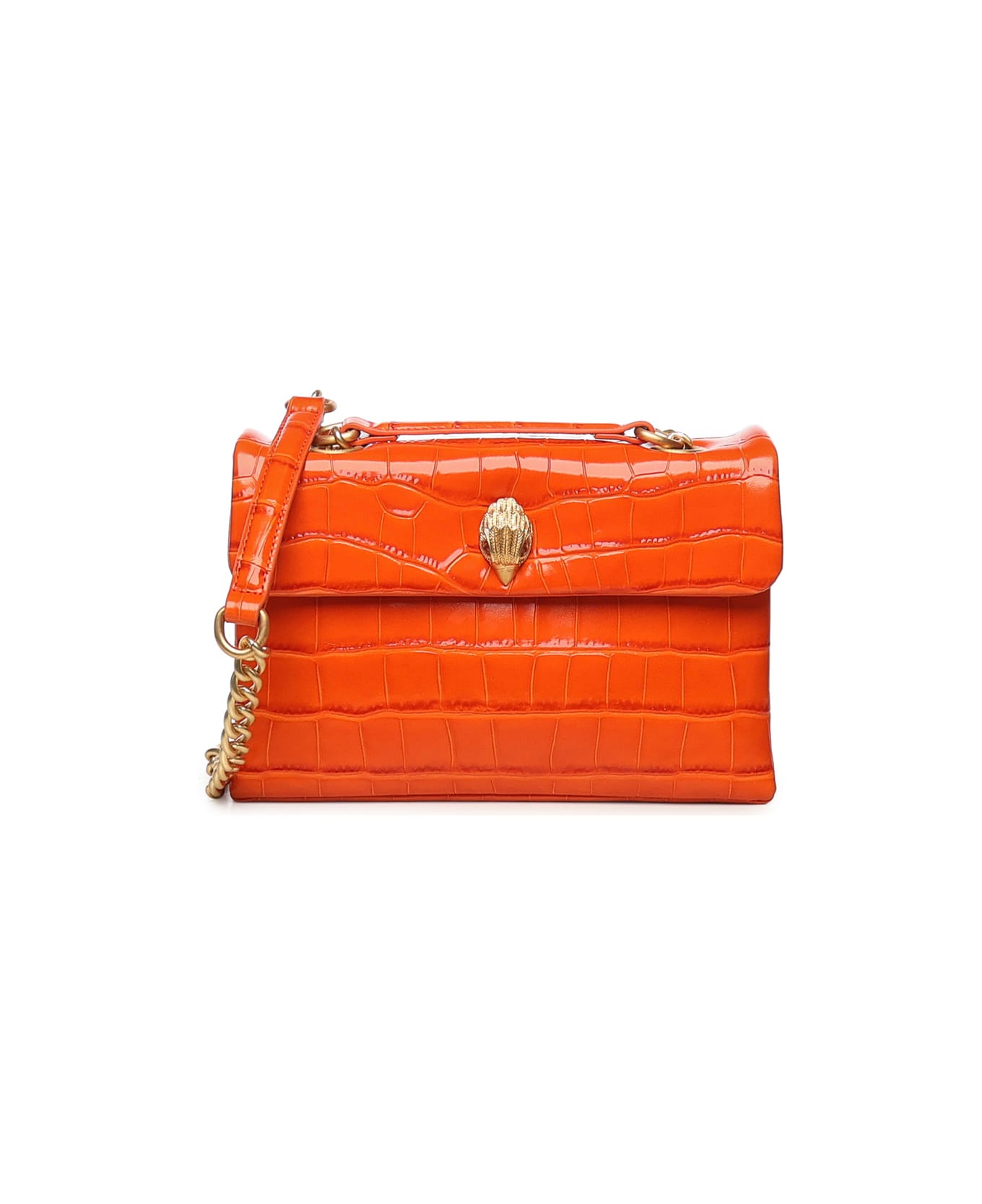- Made of printed calfskin - Antiqued brass chain shoulder strap with two padded leather inserts - Magnetic closure - Embossed gold-foil logo on the back - Dimensions: 26 x 18 x 9 cm - Color: Orange