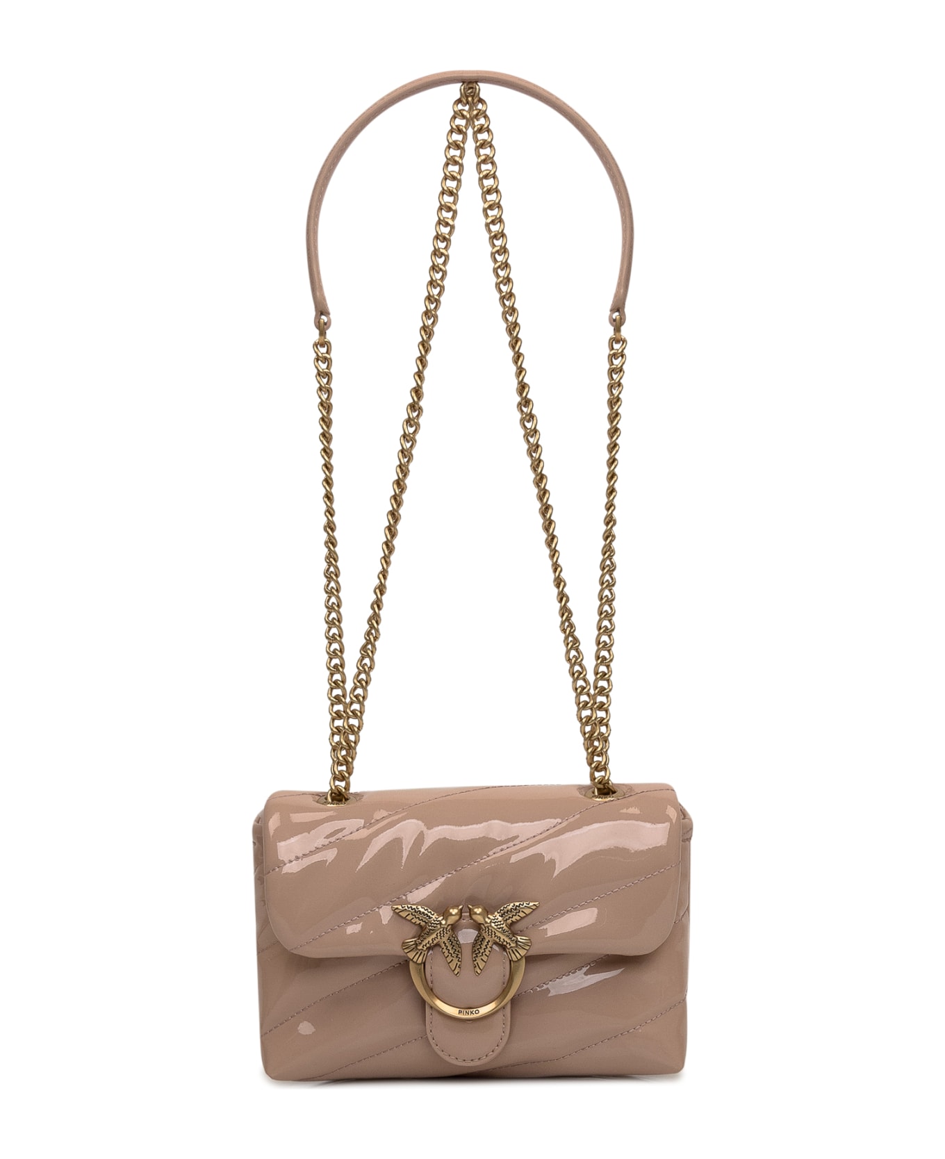 Pink padded shoulder bag. Glossy finish. Strap in fabric with chain. Characteristic Love Birds buckle. Flap at the top with magnetic closure. Single compartment. Inside pocket with zip.
