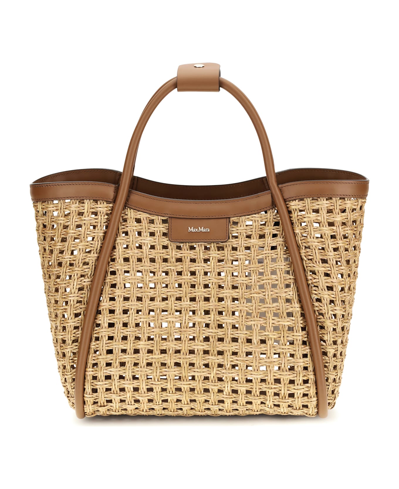 The marine tote bag by max mara is an elegant and versatile shopping bag, crafted from raffia with leather trim along the edges and a metal logo detail on the front. featuring two round leather handles and a magnetic button closure, it has an unlined interior with a pouch and protective metal studs on the bottom, combining functionality with refined style.