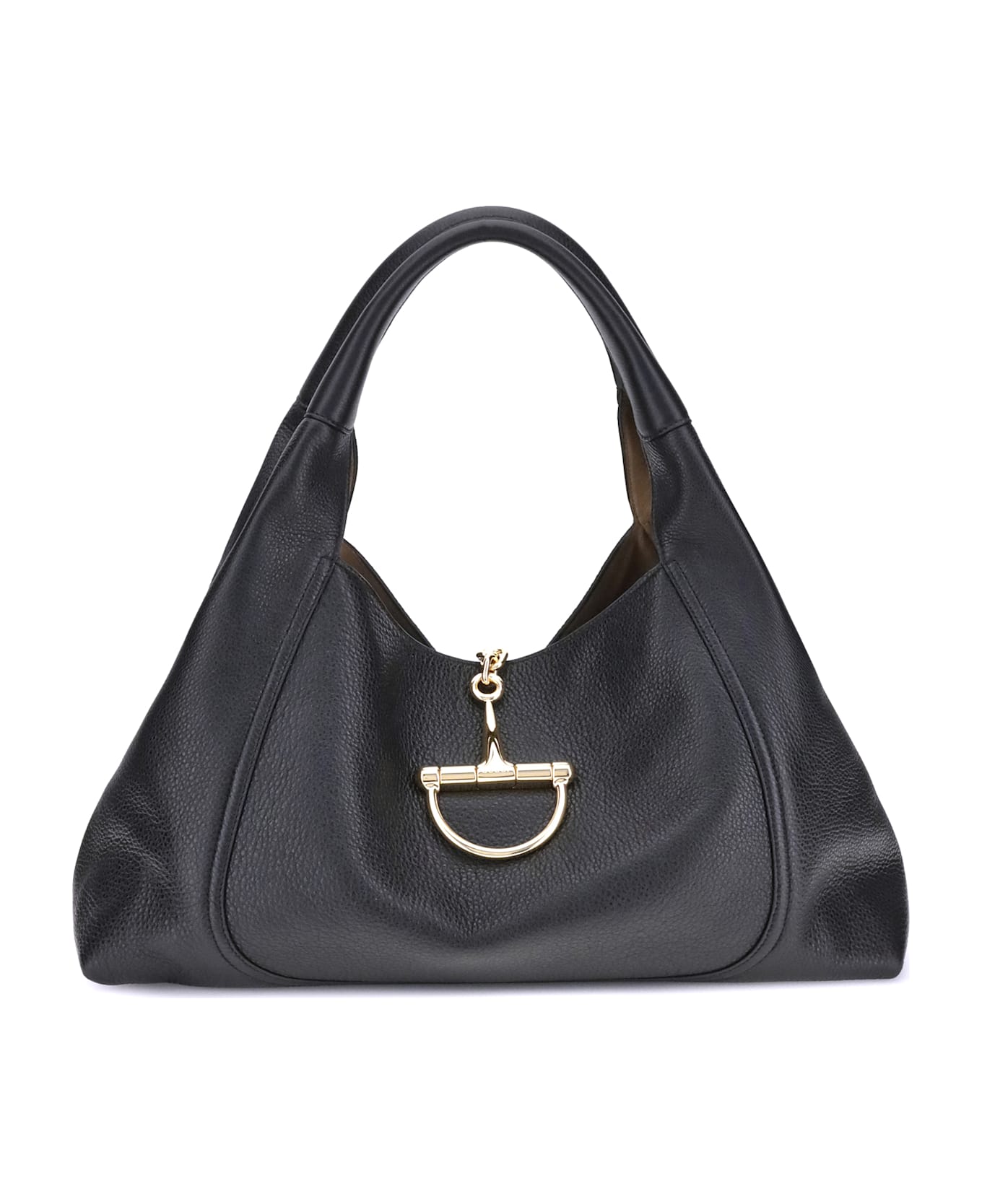 Gucci's softbit maxi shoulder bag is an imposing and elegant accessory, ideal for those seeking space and style. crafted in refined black grained leather, it offers rich texture and lasting strength. gold-tone hardware adds a touch of classic luxury, contrasting with the warm brown microfiber lining. functional and versatile, it includes a handy detachable pouch for smaller items and a convenient shoulder strap that allows it to be carried comfortably on the shoulder, making it perfect for daily use or travel.