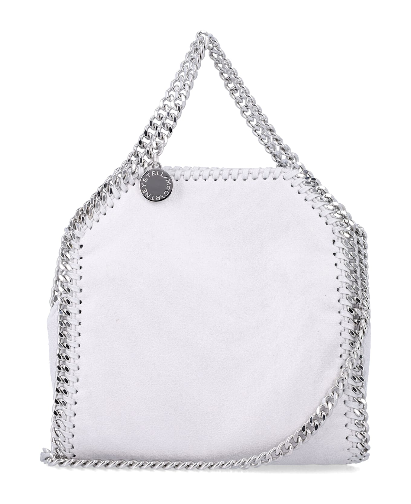 The Falabella Tiny Tote From Stella Mccartney Holds Small And Medium Essentials, Including Phones And Wallets, In A Sustainable Vegan Fabric With Semi-gloss Finish. Featuring The Iconic Diamond-effect Chain, Waxed Organic Cotton Detailing, Dual Handles, And A Detachable Shoulder Strap, It Combines Ethical Craftsmanship With Everyday Luxury. Vegan Material With Semi-gloss Finish Diamond-effect Chain In Recycled Brass And Aluminum Waxed Organic Cotton Detailing Certified Gots Two Top Handles And A Detachable Shoulder Strap Main Compartment With Internal Slip Pocket Magnetic Snap Closure Medallion Logo Treated With Ruthenium Polyester Recycled Monogrammed Lining Width: 18 Cm Height: 17,5 Cm Depth: 6 Cm Handle Drop: 7 Cm