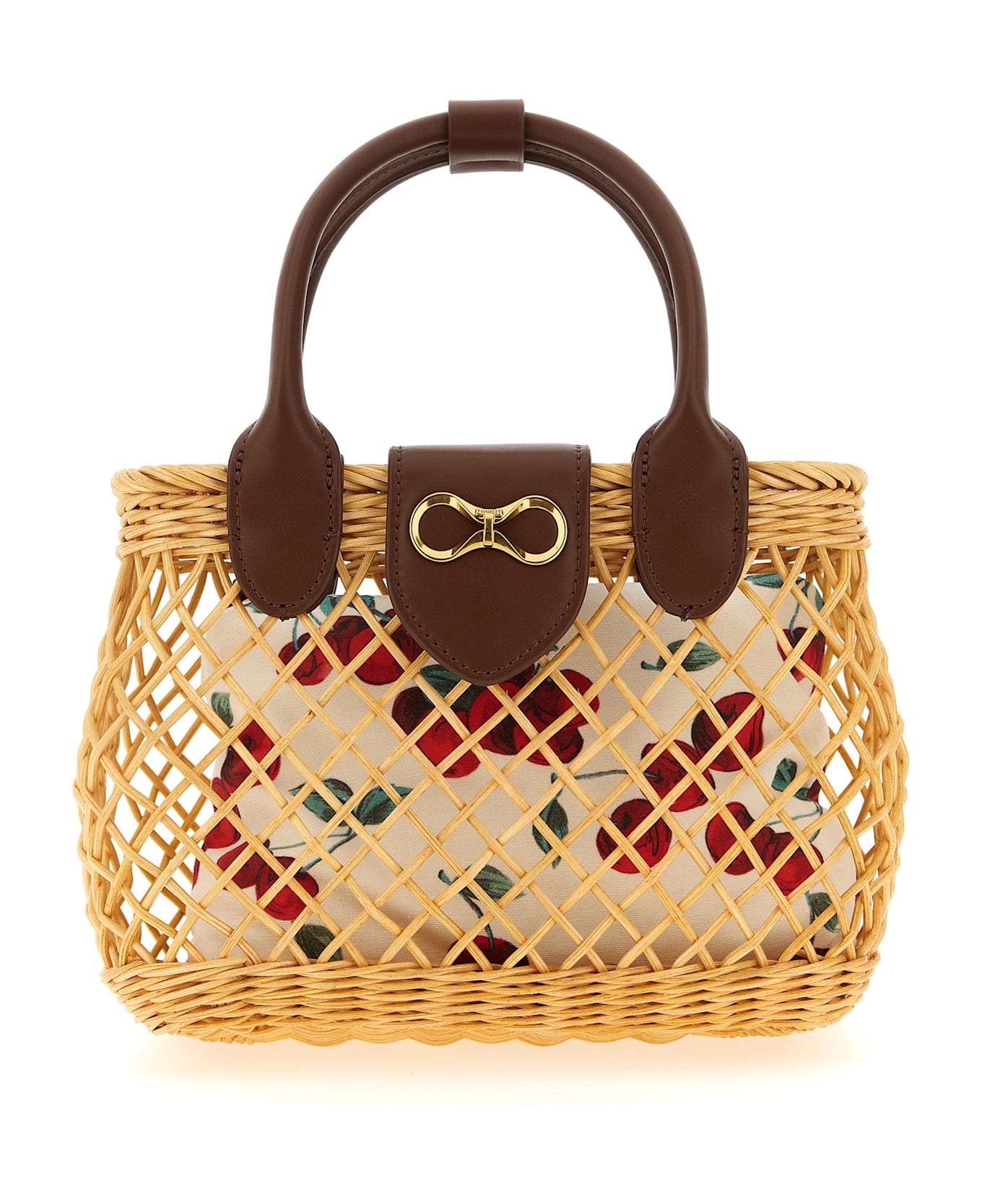 Hand-woven wicker shoulder strap with contrasting smooth leather-effect fabric details, basket design, interior clutch bag in patterned canvas, magnetic closure with front metal logo strap, double fixed handle, adjustable and removable shoulder strap. Handcrafted product, any imperfections are to be considered characteristics of uniqueness.
