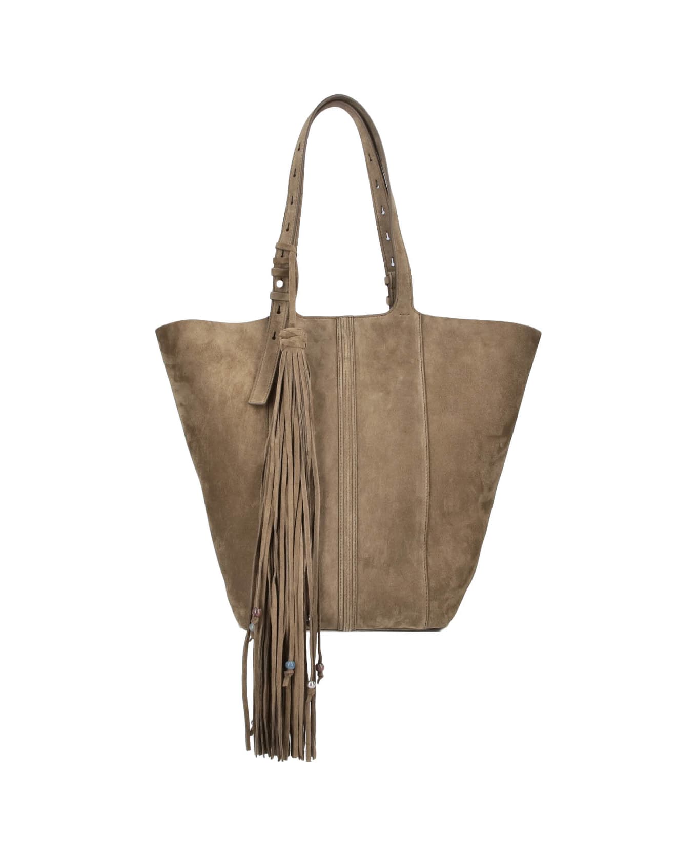 Golden Goose "24/7" tote bag in brown calf suede, two adjustable top handles, front fringes, metal closure, a removable pouch, a main compartment. Composition: 100% Calf Leather