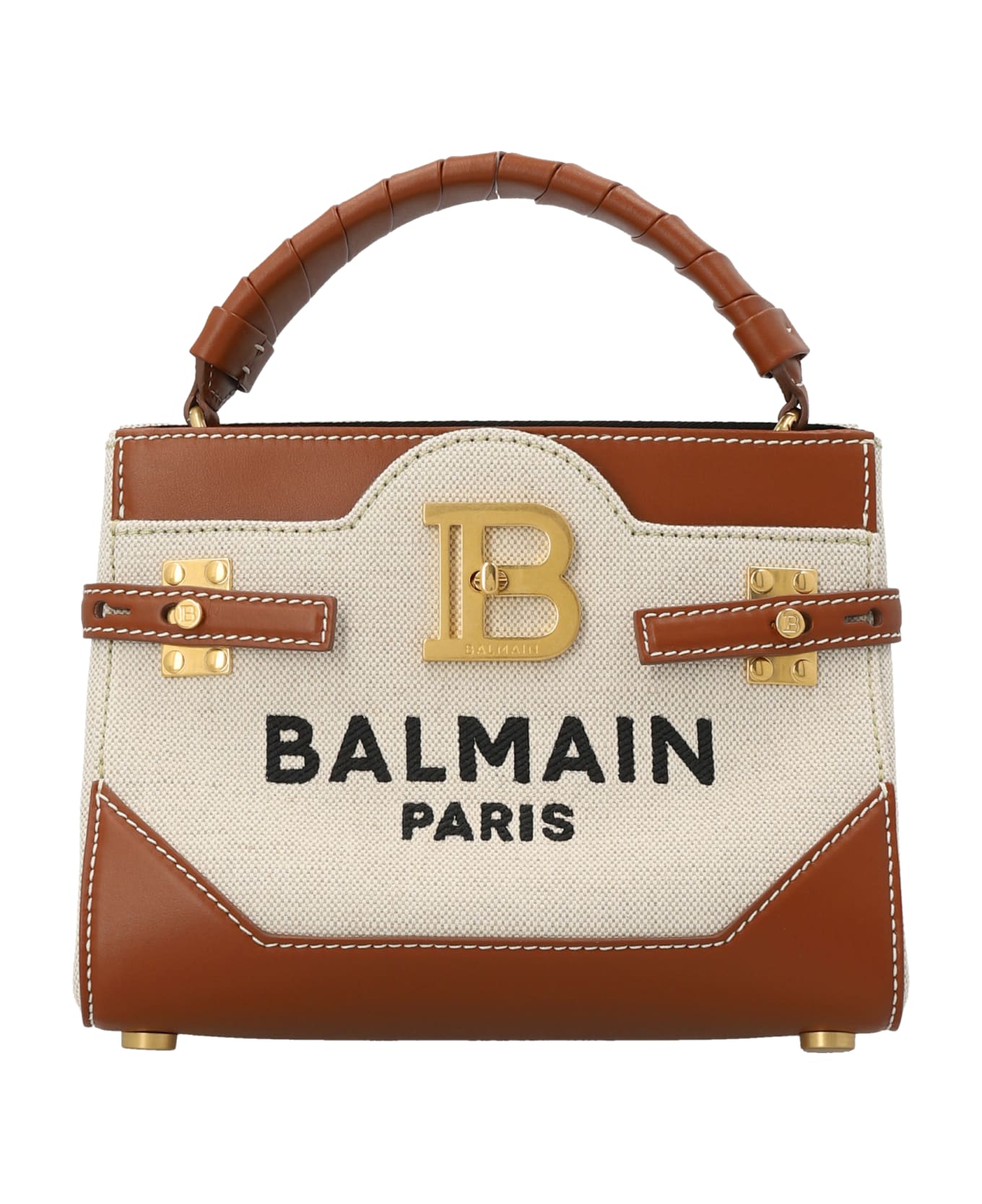 B buzz 22' leather handbag with front metal logo, handle and a removable shoulder strap.