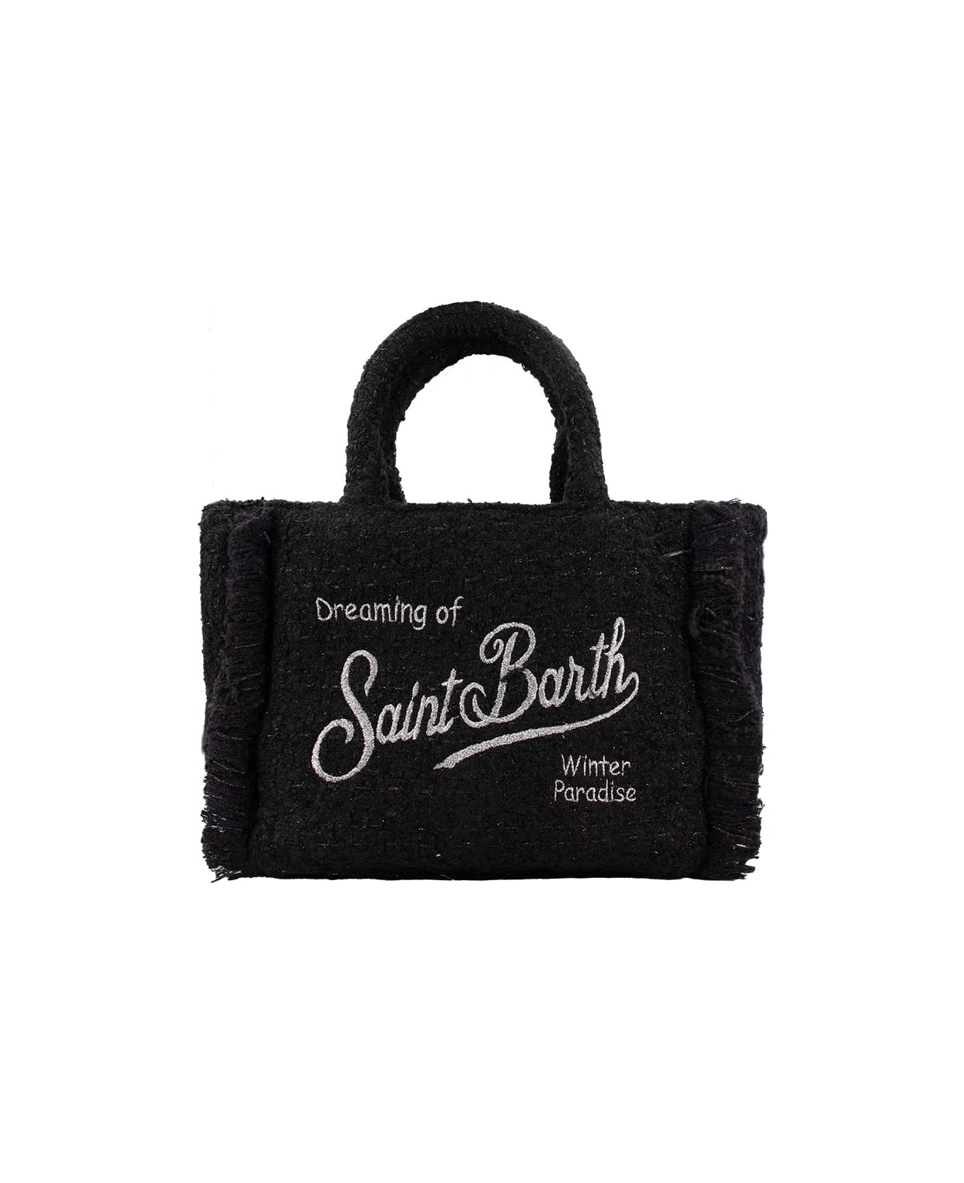 Black tweed Colette bag with fringes, top zip fastening, handles and adjustable faux leather shoulder strap. Iconic embroidered logo on the front and back. Dimensions: 27. 5 x22. 5 x12 cm Composition: 70% PL, 30% WO