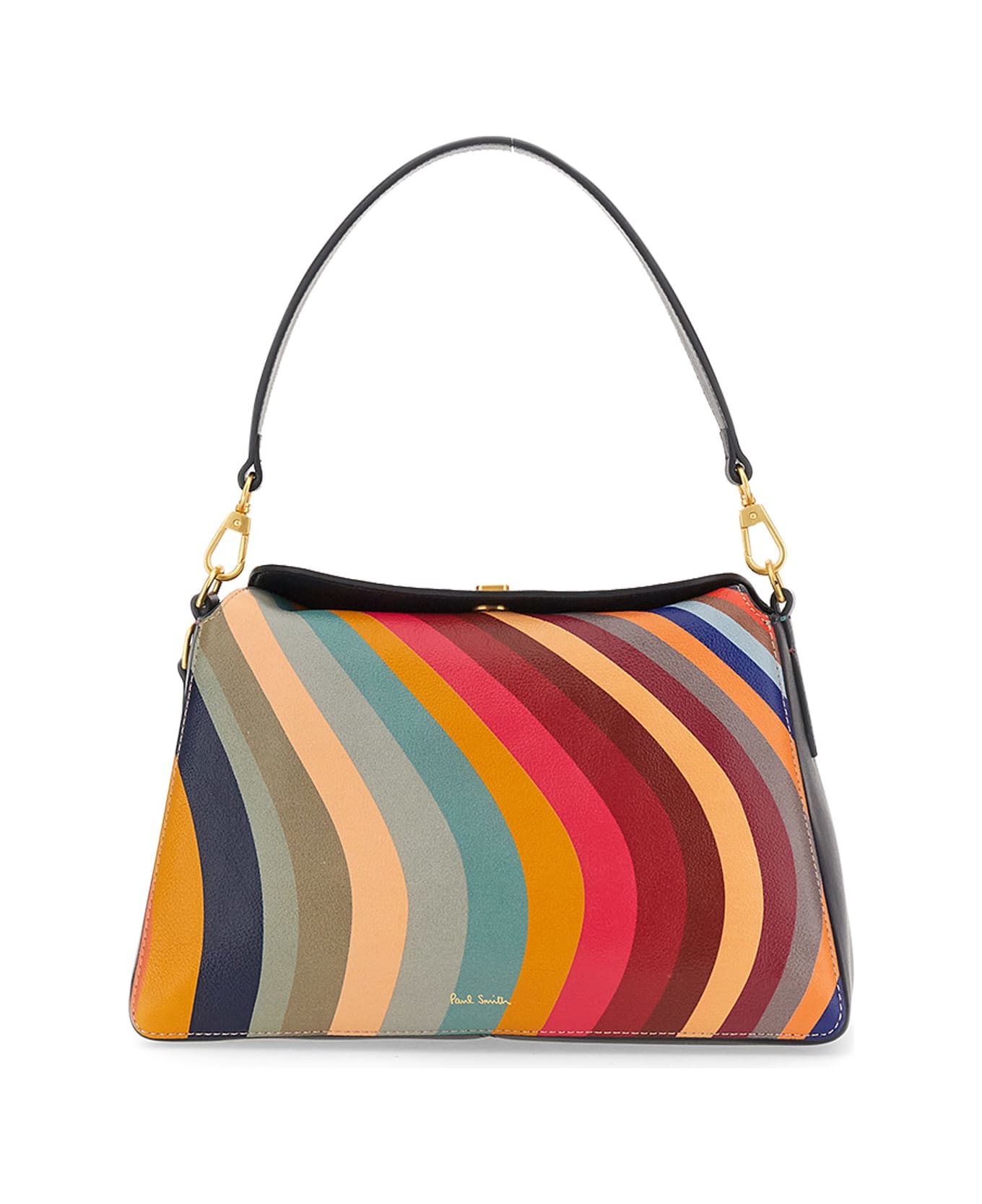Shoulder bag with multicolor striped pattern. Finished with blue leather details. Gold twist lock closure. Removable shoulder strap. Inside pocket with zip. Dimensions: 17 x 29 x 10 cm. Composition: 100% leather. Made in China.