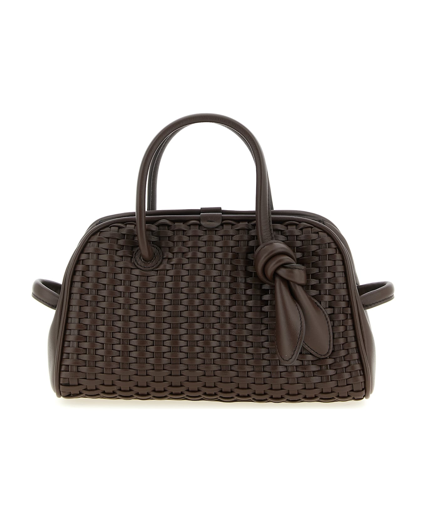 Le Petit Turismo' bowling handbag woven suede with chevron pattern, front embossed logo, double fixed tubular handle with tone-on-tone bow detail, top zip closure, adjustable and removable shoulder strap. Each leather is unique and has been carefully selected by a team of artisans. The model may have any imperfections or natural color variations.