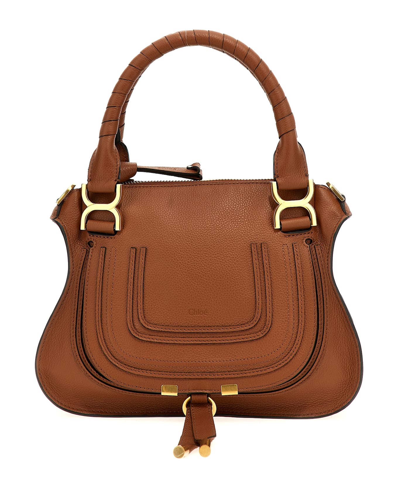 Small 'Marcie' handbag in grenade calf leather, large compartment, zip closure, open front pocket hidden by flap, inner zip pocket, removable and adjustable leather shoulder strap with hooks, linen lined interior, double handle. SUSTAINABLE: To make this product, Chloé worked with tanneries with Leather Working Group (LWG) certification, which is based on water and energy consumption and chemical, solid waste and slurry management policy.
