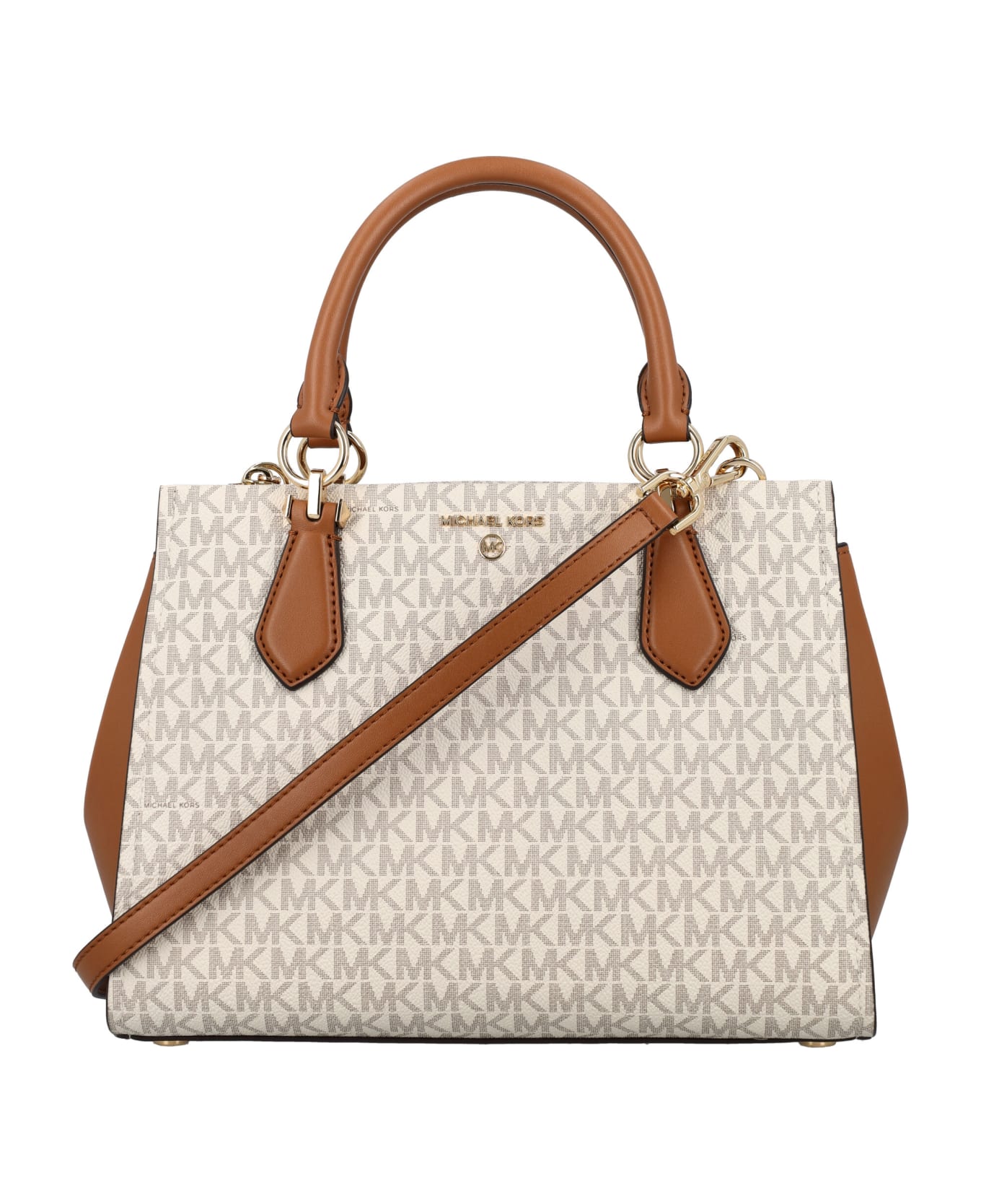 Marilyn Medium Ogo Satchel By Michael Kors. Featuring: Detachable And Adjustable Shoulder Strap Double Top Handles Gold-tone Hardware Zip Closure On Top Embossed Logo At Front "mk" Logo Pattern Panels At Front And Back Main Compartment Inner Flat Pockets Inner Zip Pocket Metal Foots At Bottom Height: 22cm Width: 29cm Depth: 11,5cm