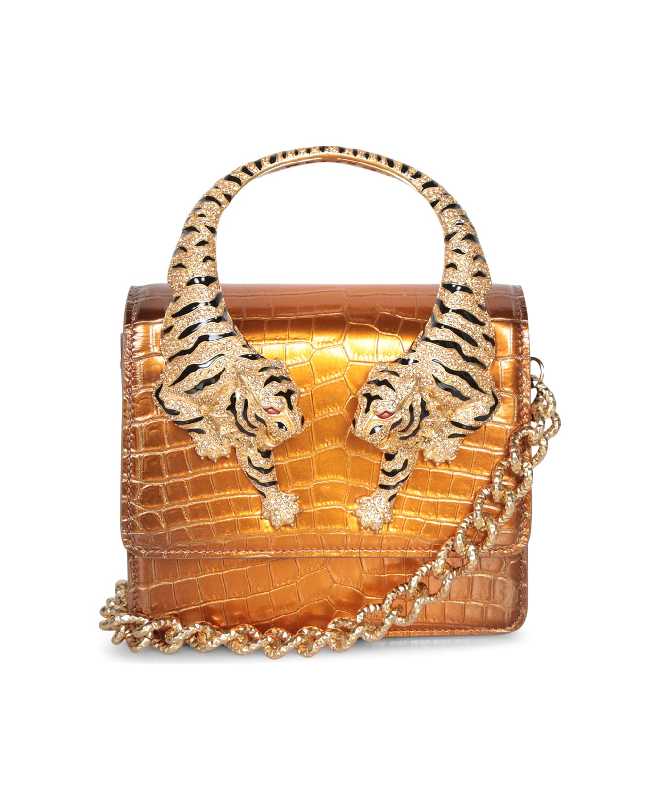 This exclusive Roar Medium bag by Roberto Cavalli flaunts a vibrant orange hue with a sophisticated crocodile effect, embellished with iconic golden lion heads that add a bold and regal touch.