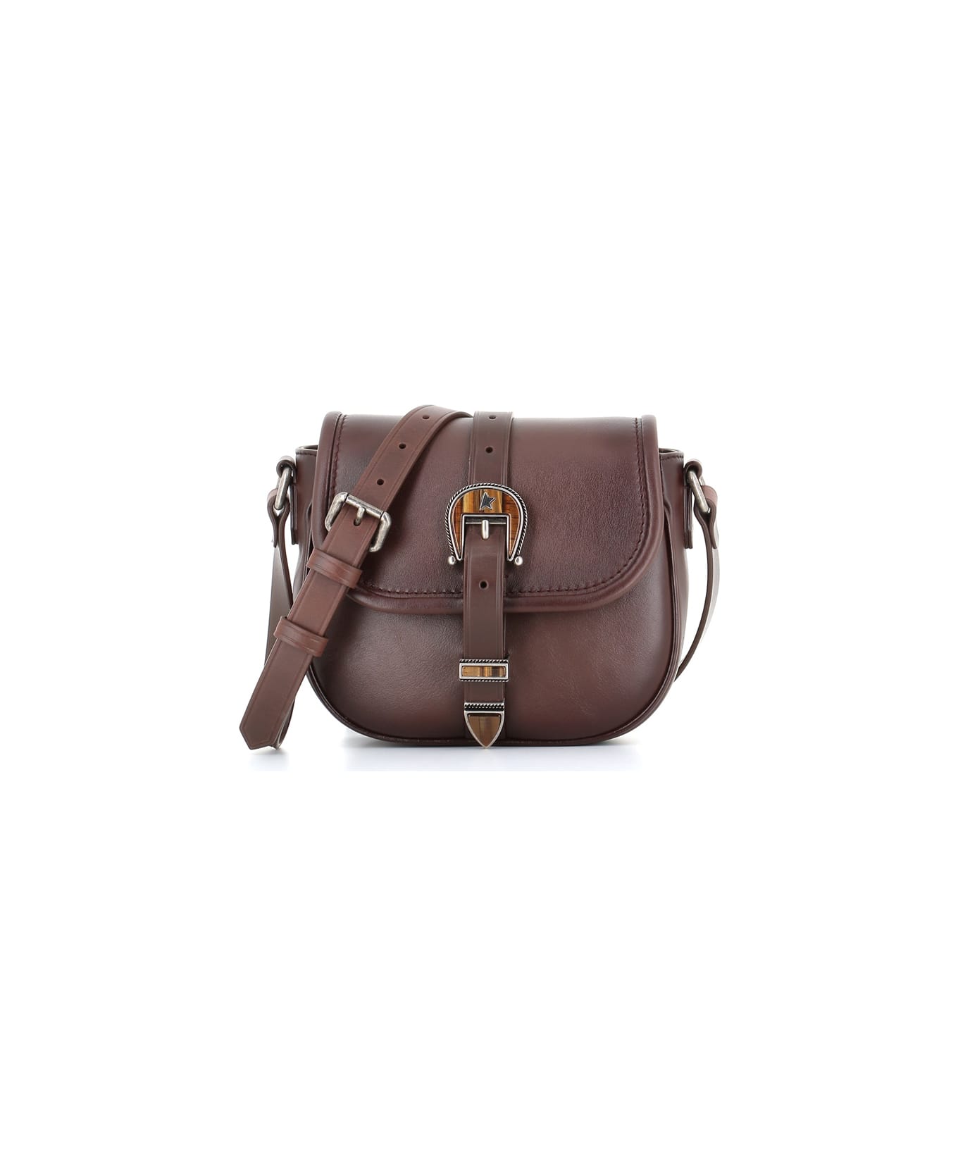 Dark brown leather shoulder bag from Golden Goose, featuring by a strap with dark silver buckle decorated with the iconic star-logo of the brand, adjustable shoulder strap and by