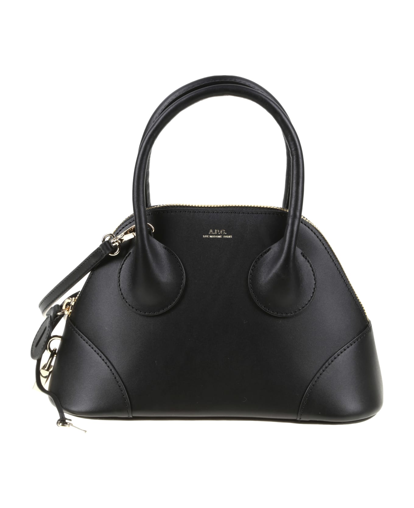 A. P. C. black satchel made of leather, handles and internal long strap, golden hardwear, logo detail at the front.