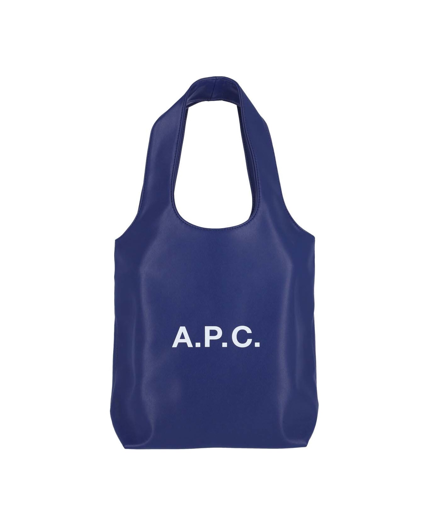 A. P. C. Ninon small tote bag in navy blue fabric with two handles, white logo print on the front, interior flat pocket, and single inner compartment.