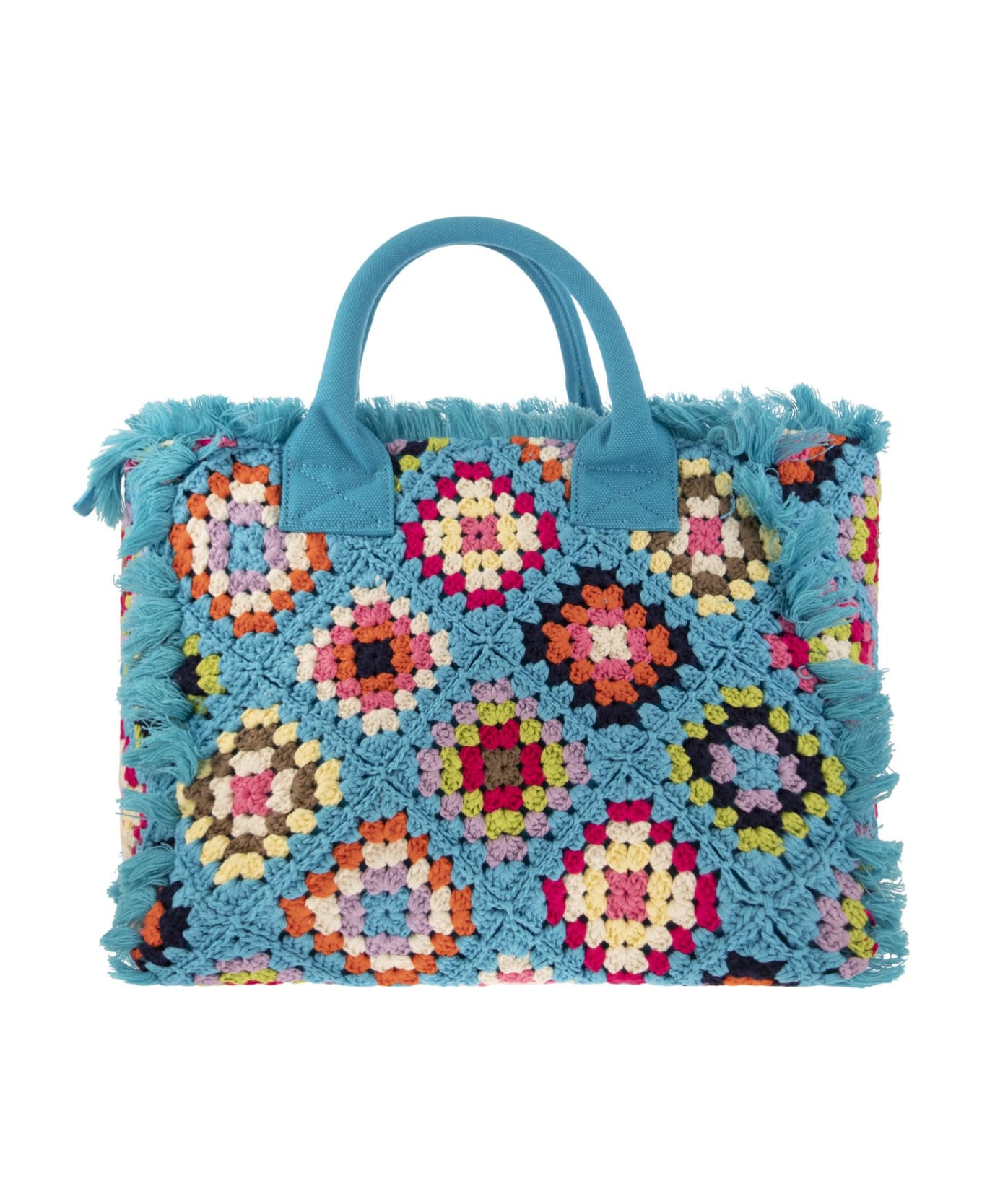 Handmade crochet vanity bag with fringes along the edges and embellished with an embroidered logo in a contrasting colour on the front. Comfortable canvas handles finish off this bag to carry with you at all times. - One zipped inside pocket - Multicoloured pattern - Zip closure - Front logo DESIGNER ID: VANI010 04643D