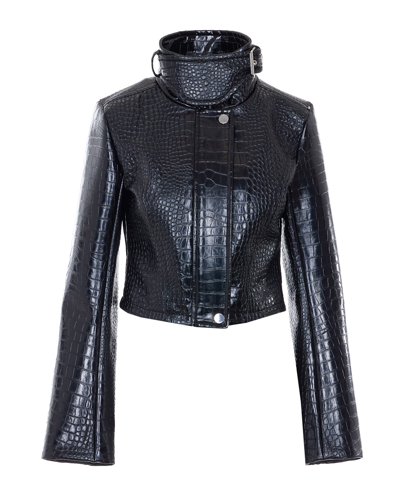Sportmax black Sultano jacket with frontal zip closure, high neck, long sleeves, strap detail with buckle closure on collar, long sleeves, crocodile print