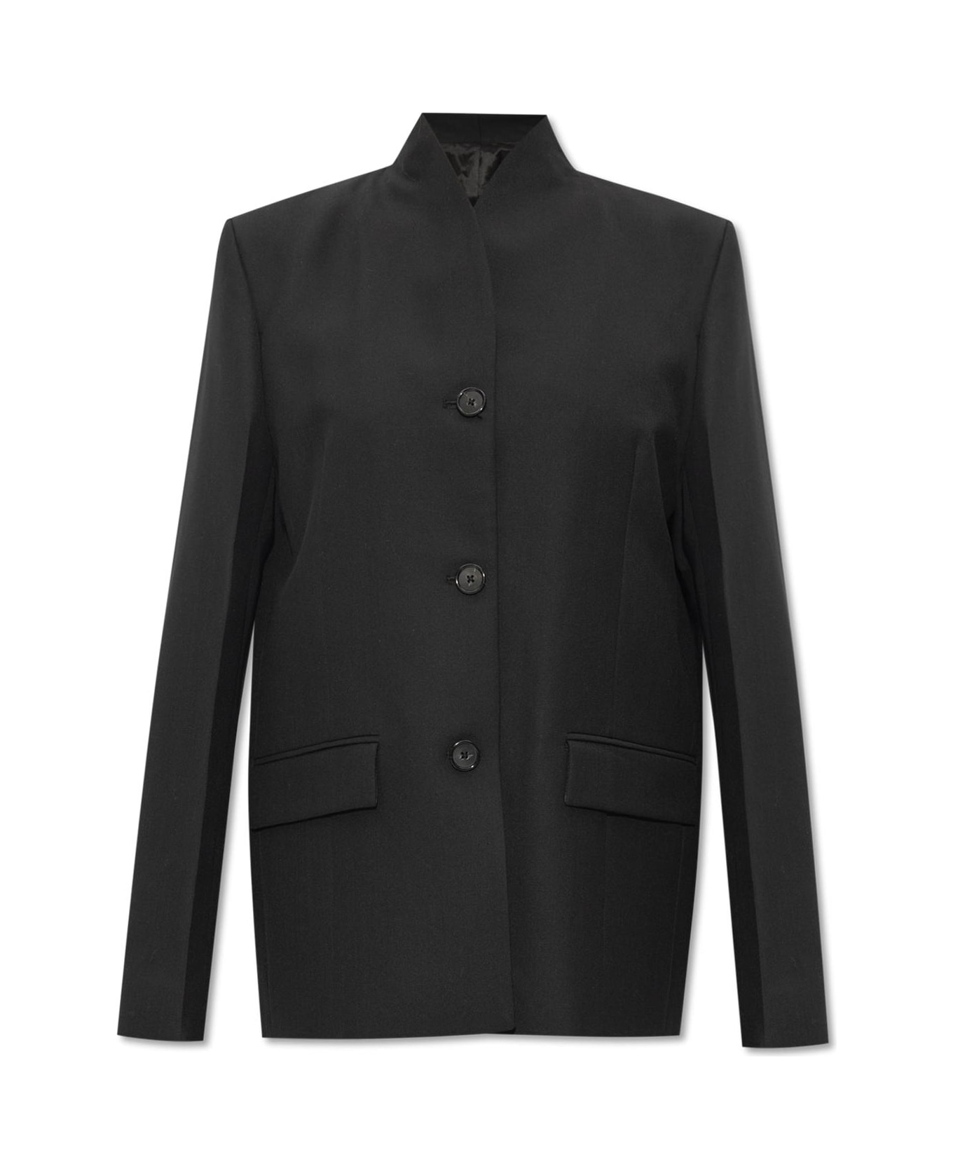 Black single-breasted blazer from Toteme. Made from a blend of recycled fabric and wool, this garment features buttons, a stand collar, two slip pockets, long sleeves with buttoned cuffs and a double rear vent.