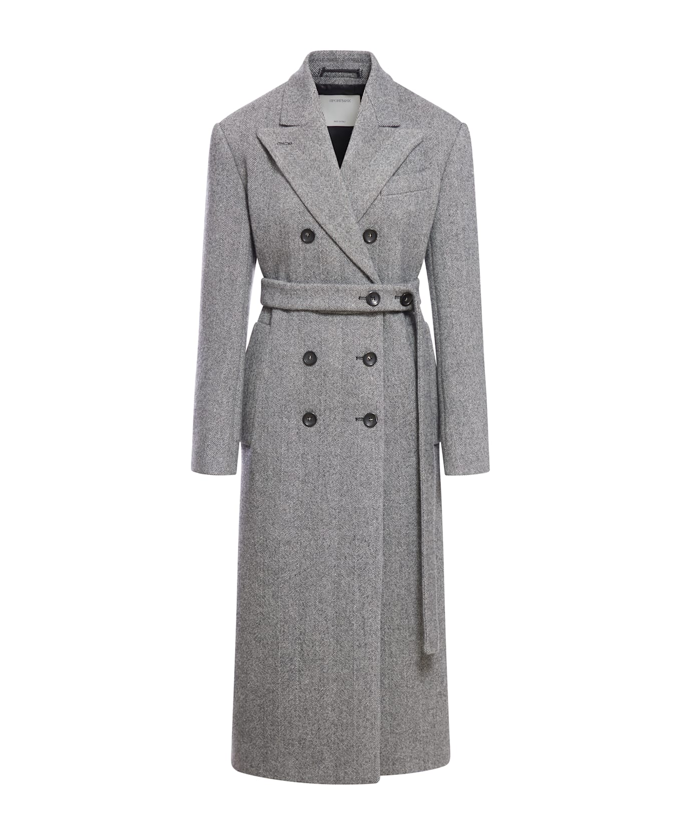 -Peak lapels -Double-breasted closure with buttons and asymmetrical belt -One breast pocket and two front pockets
