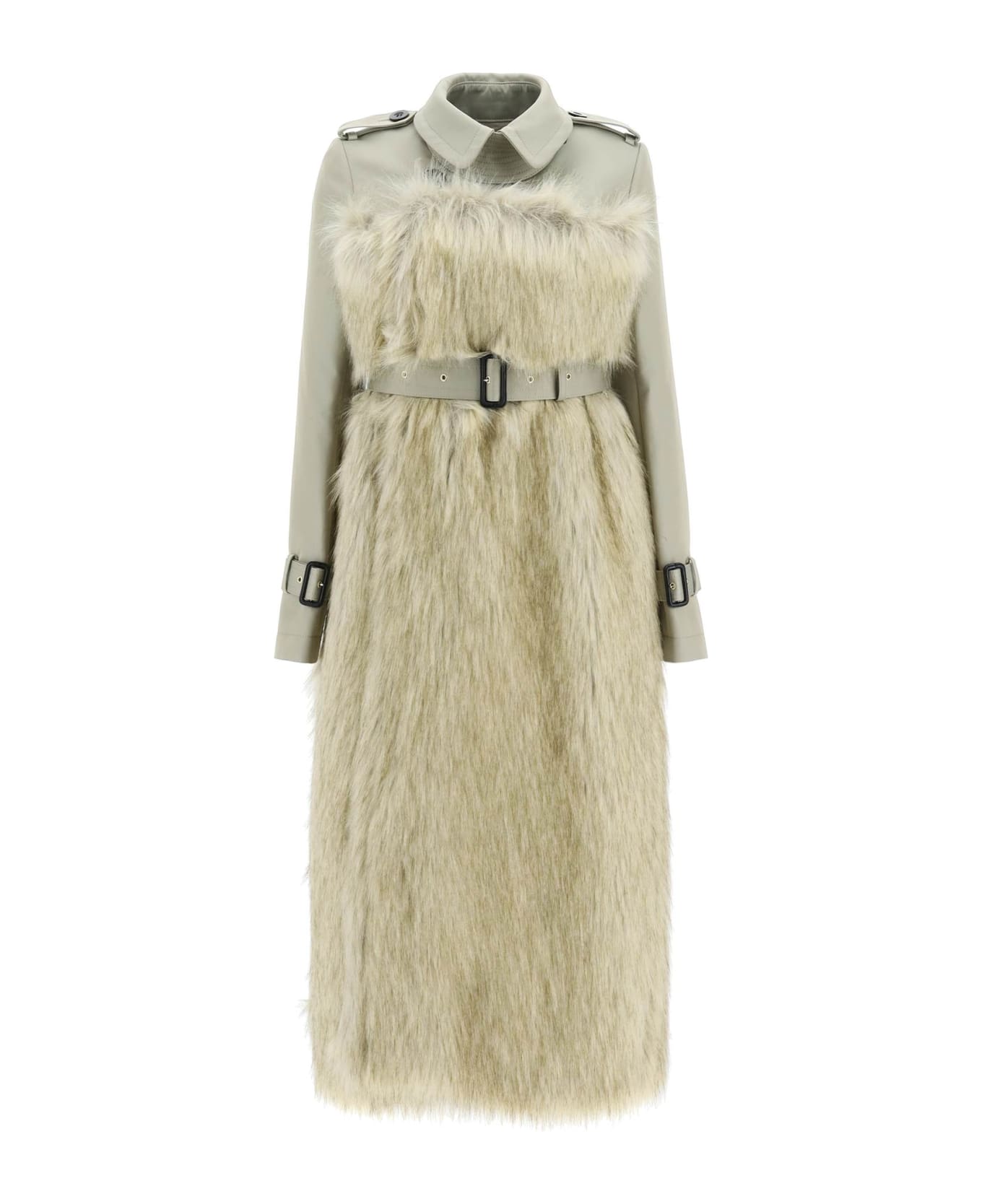 Sacai long coat in faux faur, characterized by the trench upper section crafted in cotton-blend twill. Belt closure with leather-covered buckle, wide side openings enclosed with concealed press buttons, pointed collar with curved wind-flap, epaulettes on the sleeves and adjustable buckled strap cuffs. Cupro lining. The model is 177 cm tall and wears a size 2 Sacai.