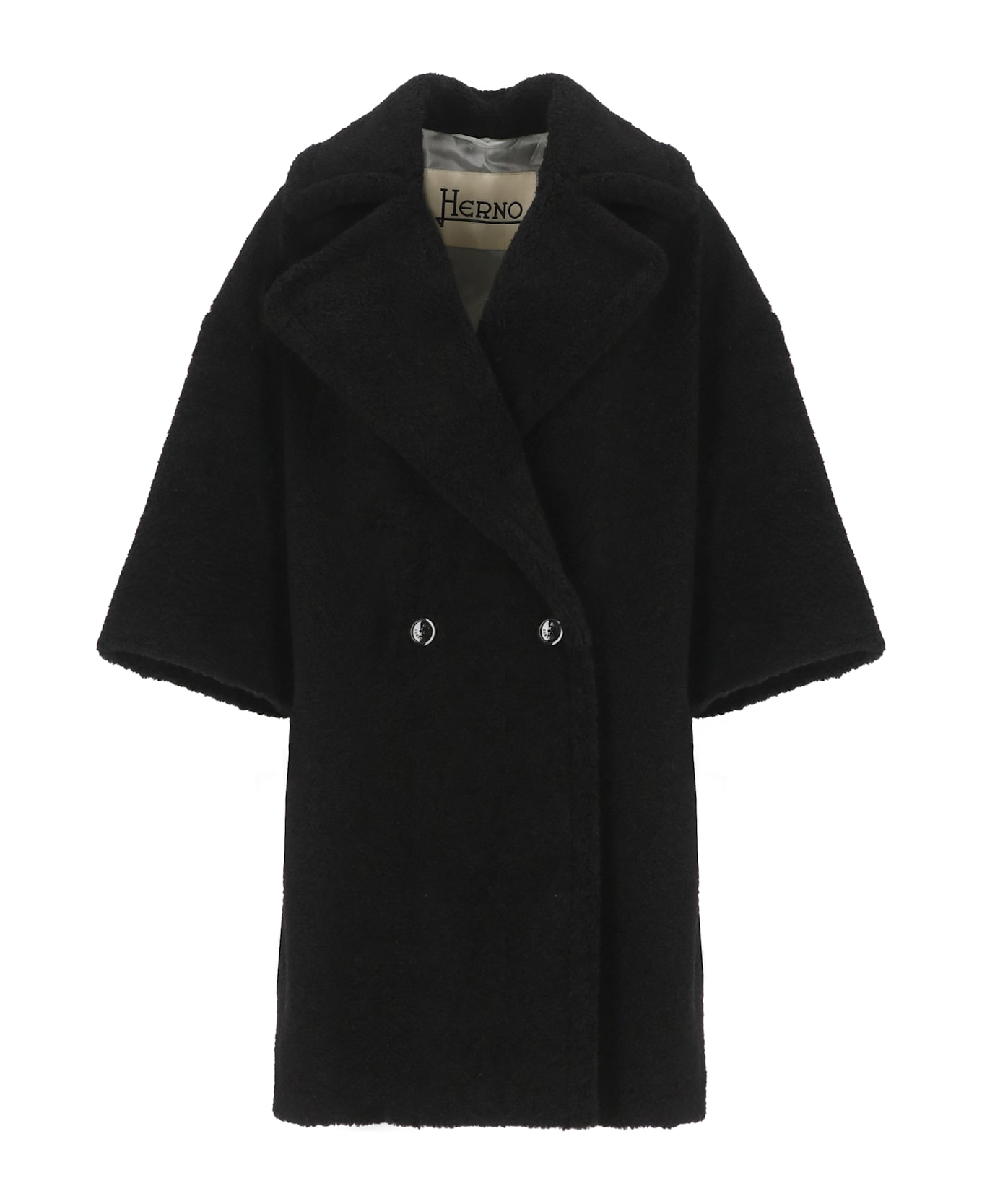 - Herno woman's black double-breasted coat - Classic lapel collar - 3/4 sleeves - Front buttons fastening - Two front slit pockets Composition: 100% Polyester Lining:, 65% Acetate, 35% Polyester