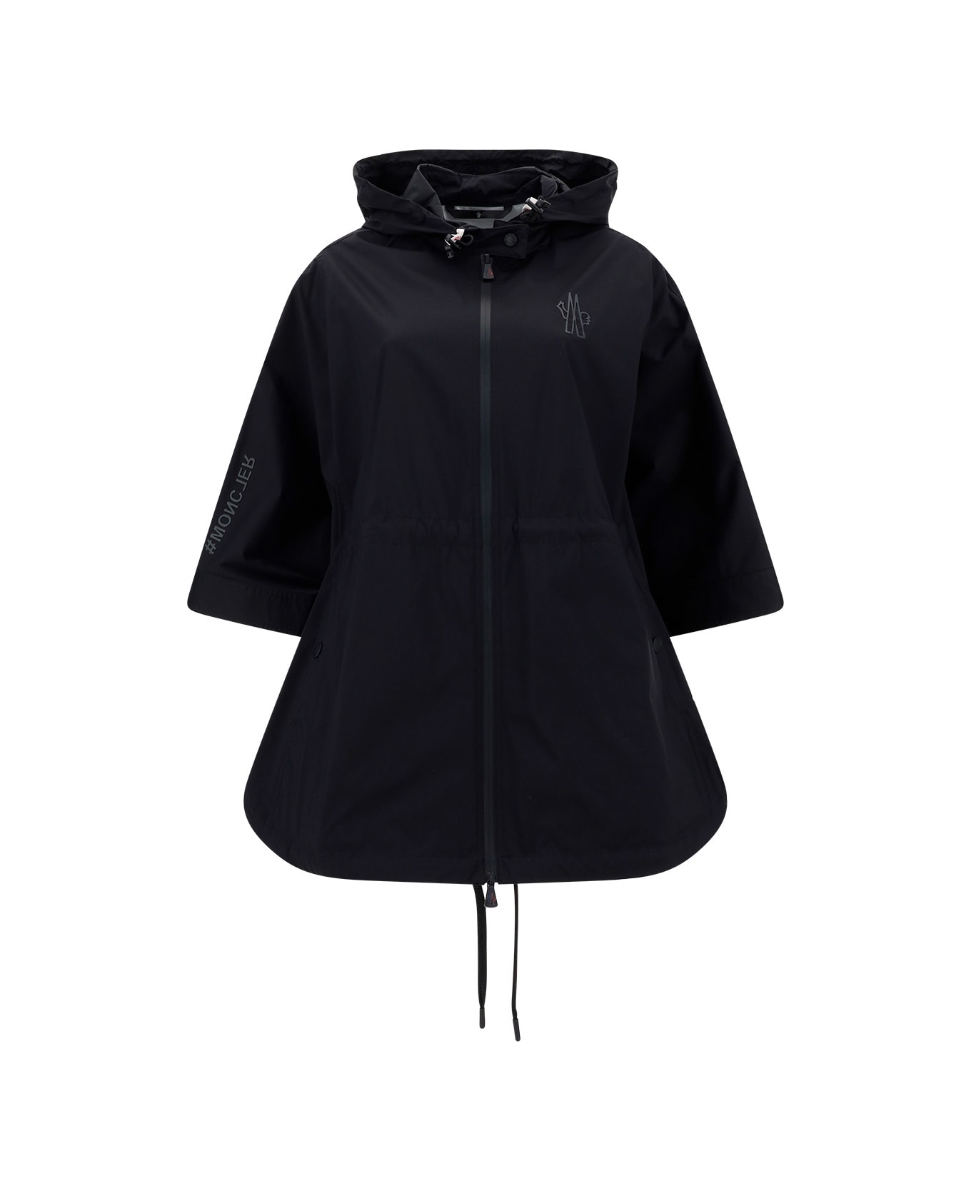 Vorassay coat by moncler grenoble, double-slider front zipper closure, model with adjustable drawstring hood, three-quarter length sleeves, two side welt pockets with zipper for closure, iconic tone-on-tone printed brand logo on front, patch kangaroo pocket on back with flap for closure, regular fit.