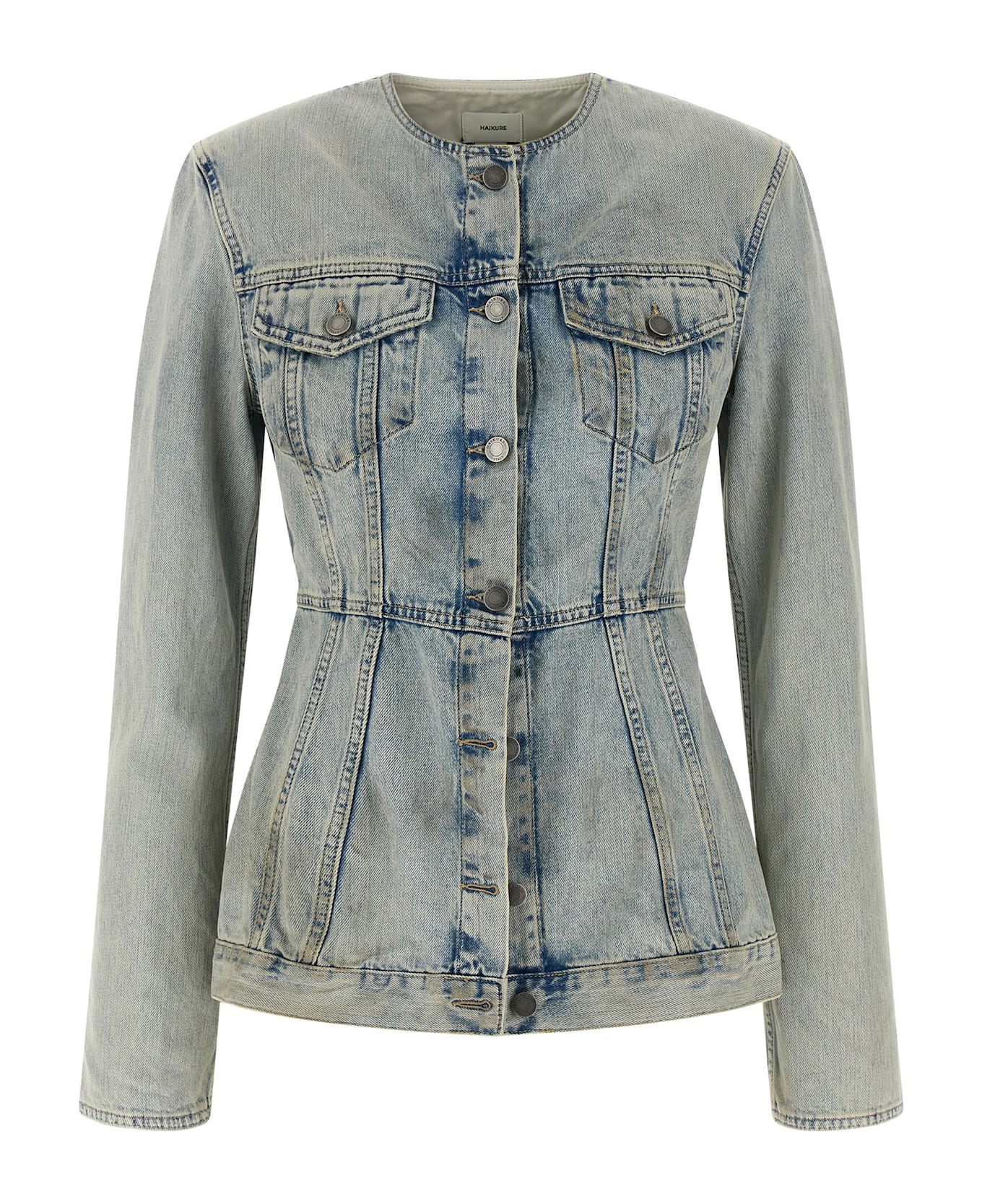'Temple' unlined jacket in used-effect stone washed cotton denim with hourglass silhouette with marked waist, crew neck, front metal button closure, pockets, long sleeves with slit on the cuffs, and leather logo label on the back.