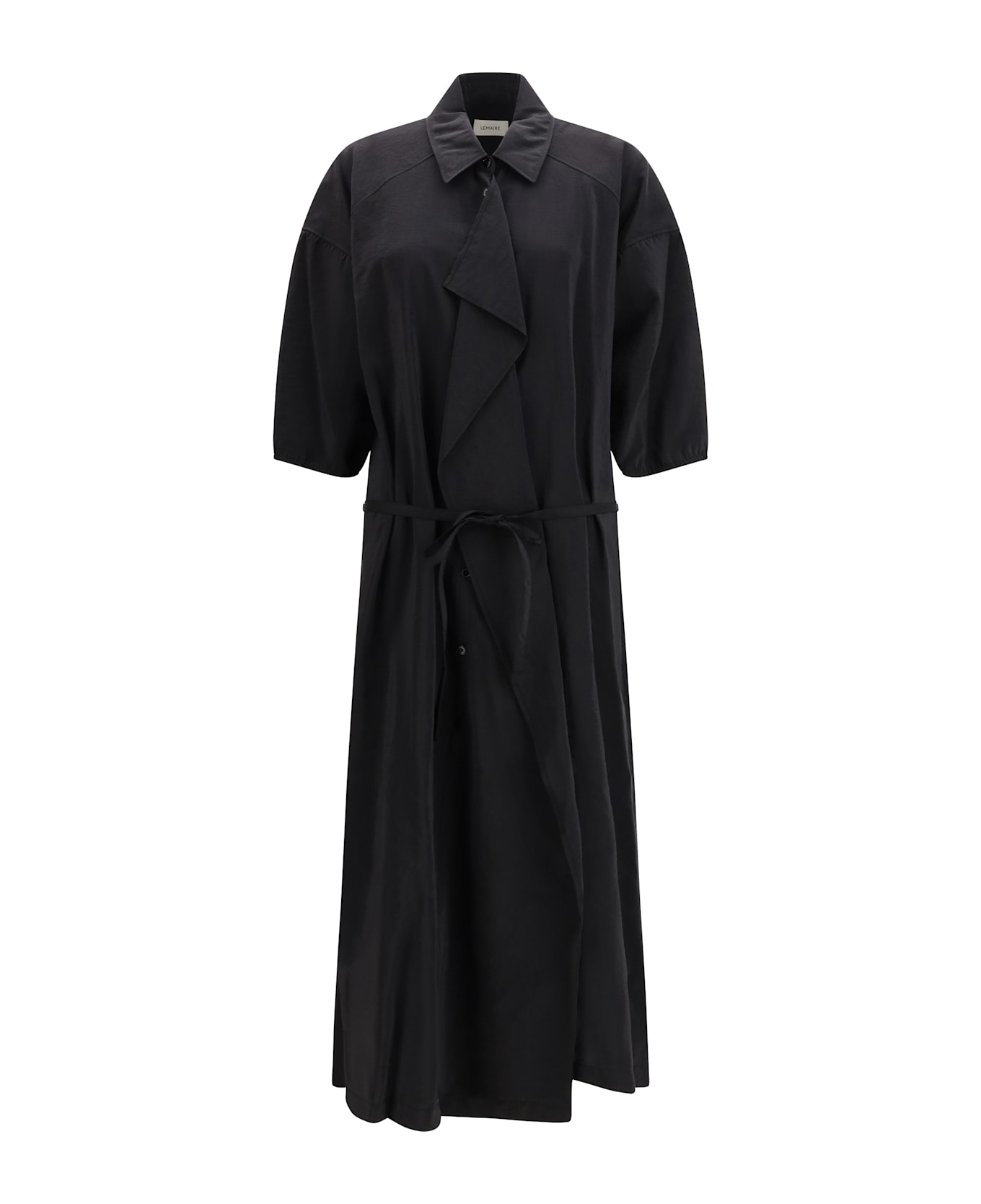 The asymmetrical silk shirt dress by lemaire is an elegant and refined garment, made from dry silk for a feeling of lightness and comfort. the loose fit and classic collar offer a comfortable fit, while the mother-of-pearl buttons add a touch of luxury. the slight gathering at the sleeves and the front center placket complete the design, while the removable belt in matching fabric allows you to customize the fit. the 3/4 sleeves add an extra touch of style, making this dress ideal for special occasions or a sophisticated everyday look.