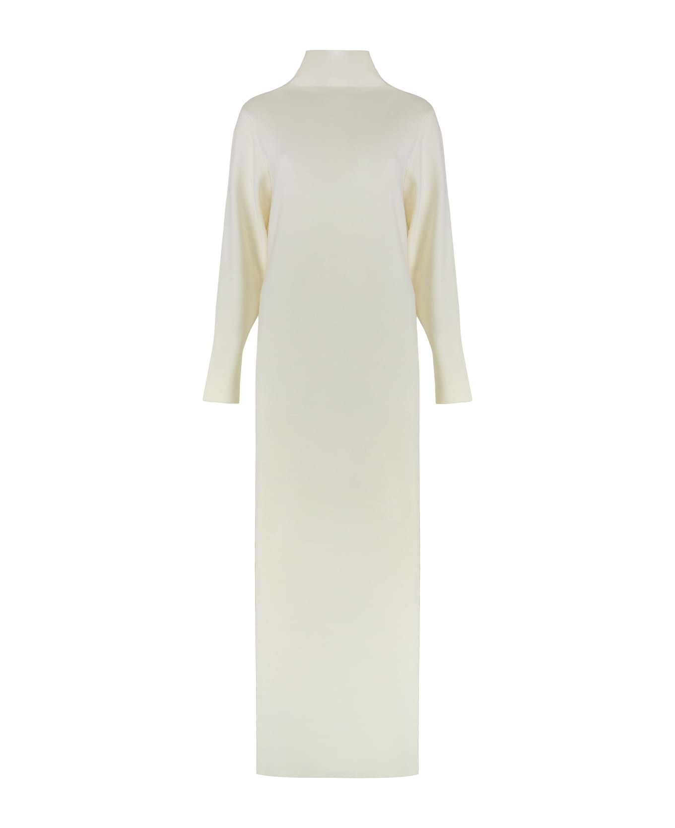 Long dress in neutral tones, made from a soft and comfortable fabric. it features a loose fit with long sleeves and a high collar.