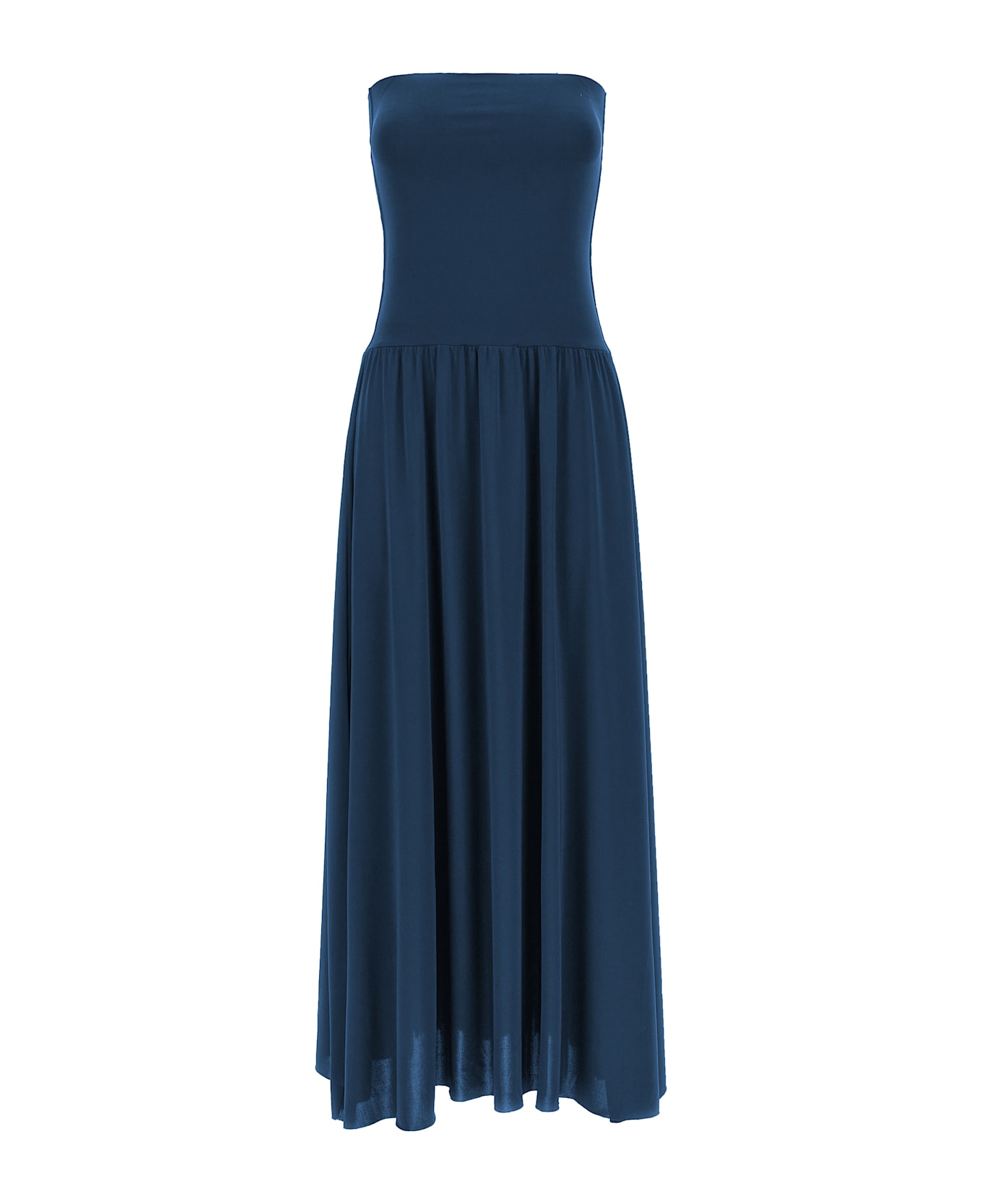 Long 'Oda' dress in Peau Douce* and fluid crêpe jersey, raw cut hem, elastic band, corset style that can also be worn as a skirt.