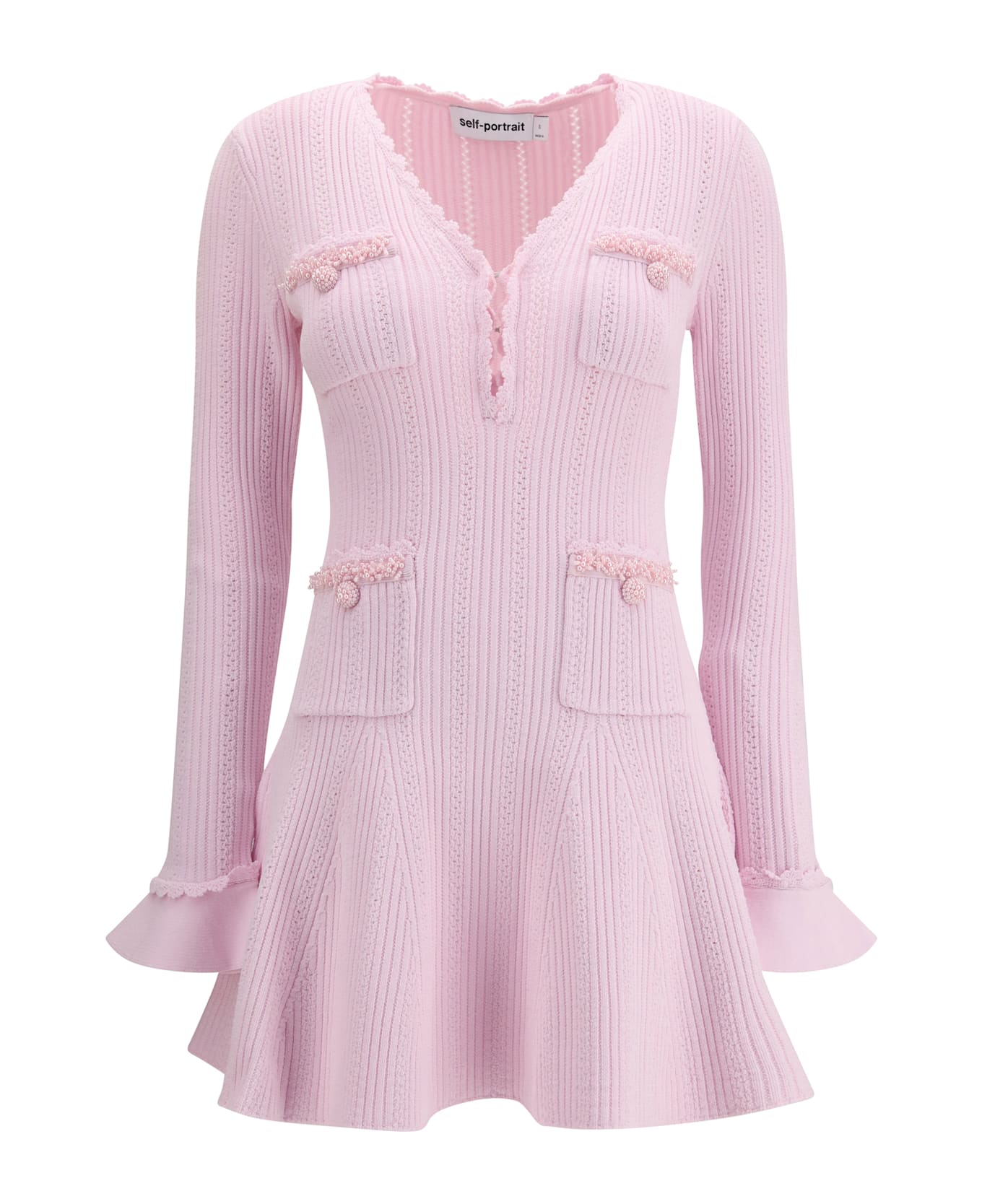 The pearl trim knit mini dress by self-portrait blends refined femininity with effortless wearability. crafted in pointelle knit, the dress offers a softly sculpted fit that follows the body with natural ease, enhanced by a subtly flared skirt that adds movement and balance. delicate pearl trims lend a polished, elegant touch, while the button-front closure and functional pockets introduce a practical, everyday appeal. a versatile piece designed to transition seamlessly from daytime commitments to evening moments.