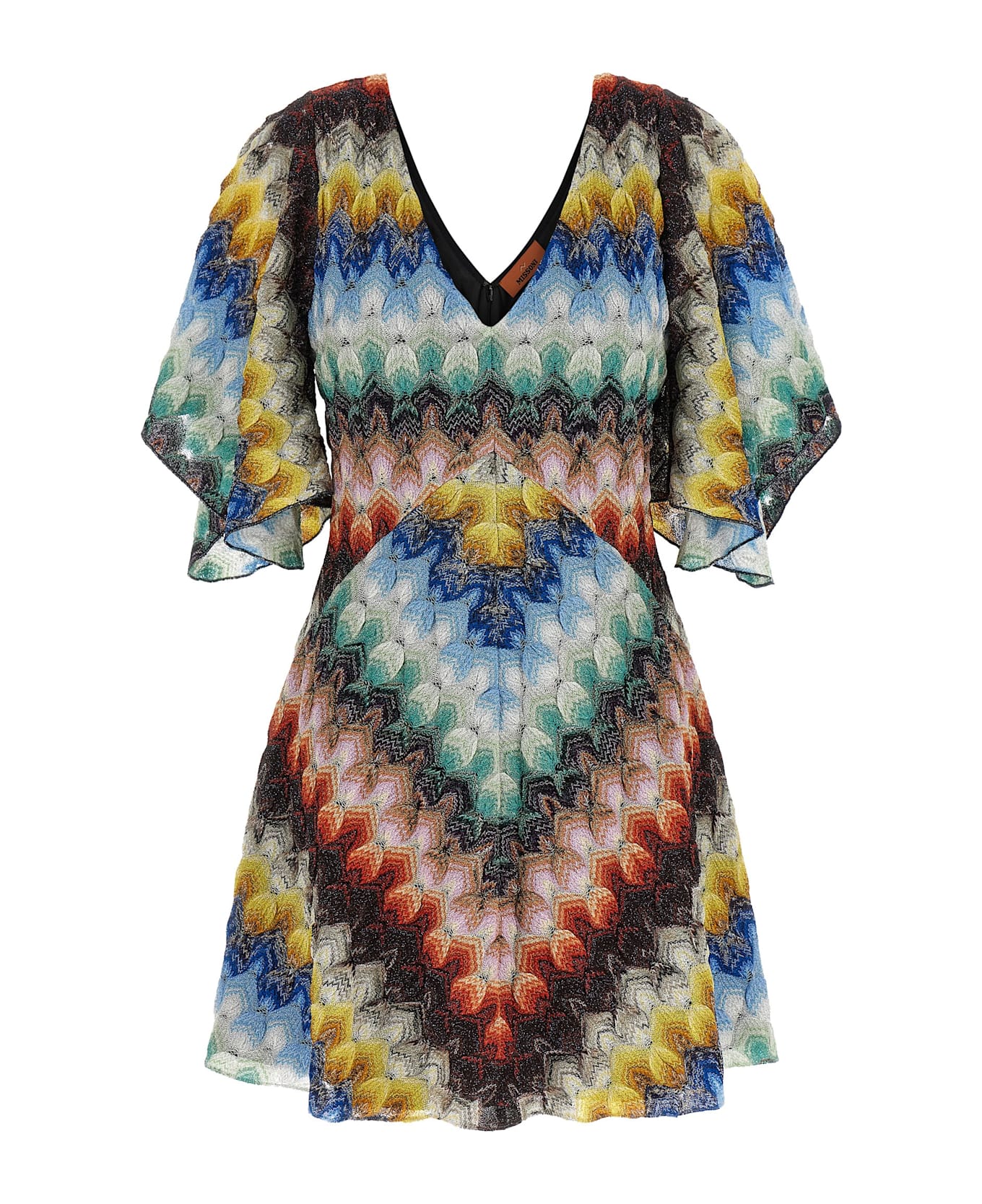 Mini dress in viscose blend lace with lamé thread made with raschel processing, V-neck, short handkerchief sleeves, back zip closure, lining. Composition: 85% viscose, 15% metal