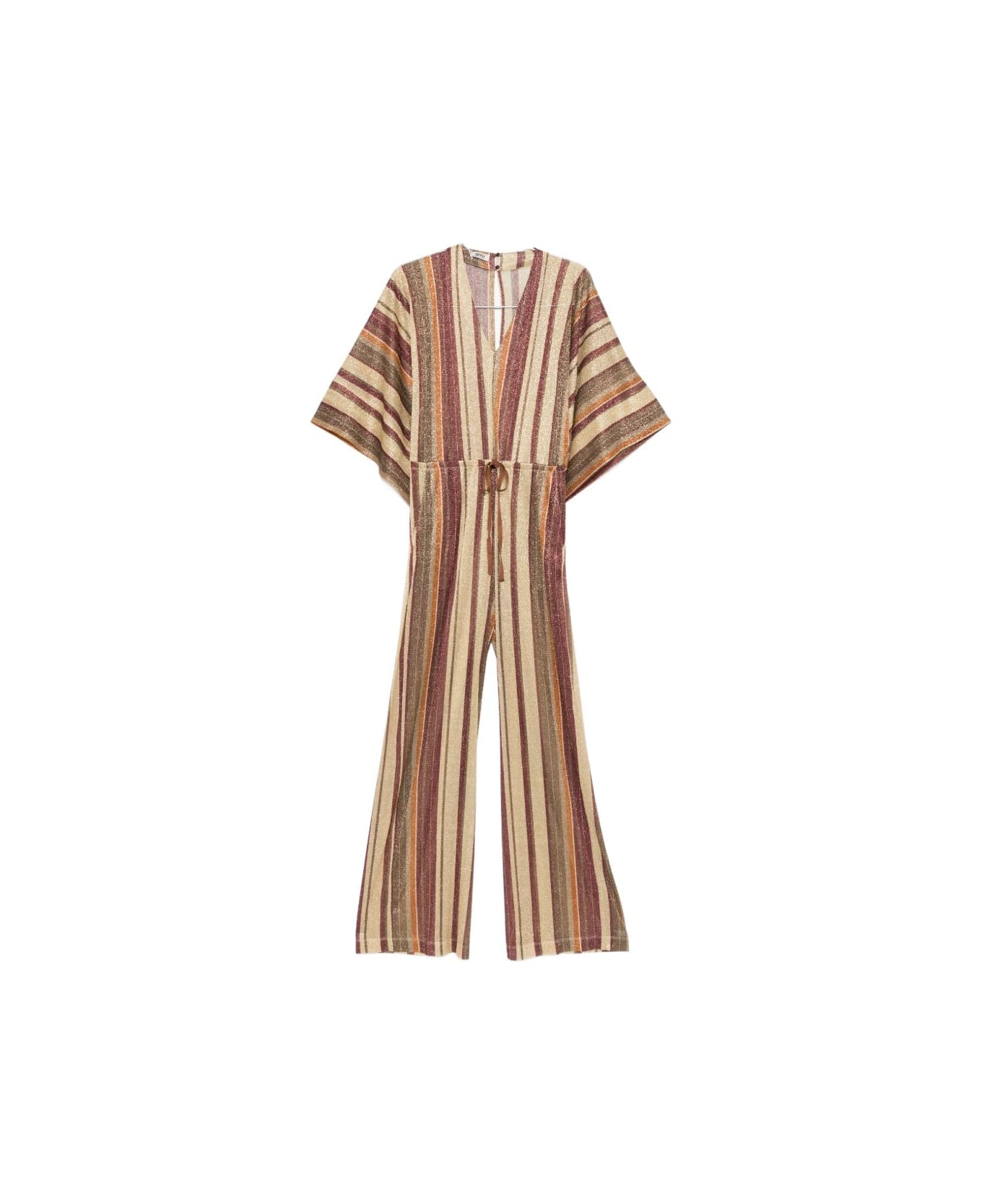 gold-tone/red/multicolour vertical stripe V-neck tie belt wide leg short sleeves
