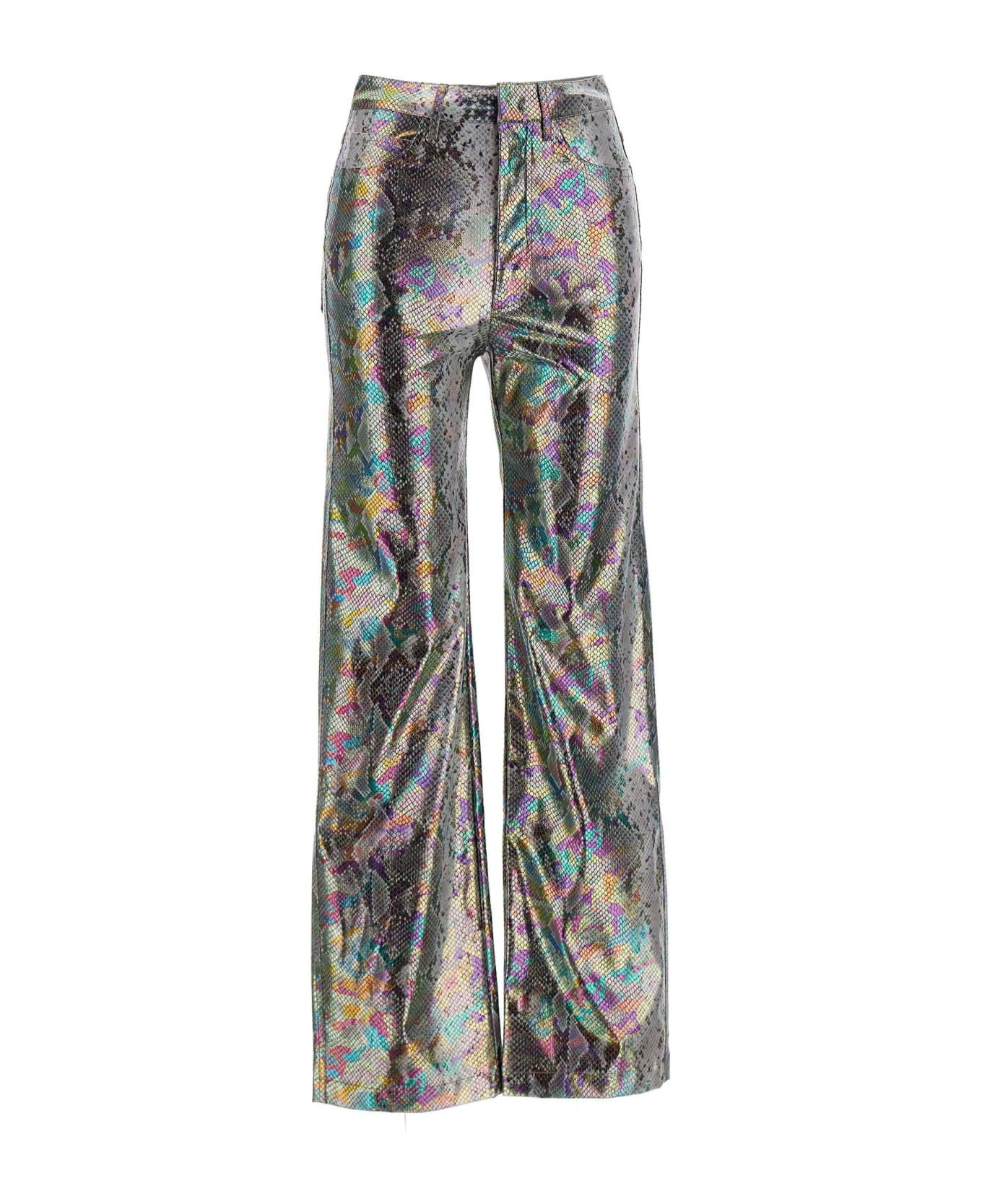 Rotate Birger Christensen Women's Pants 'Snake Pu Straight', Holographic Silver, five-pocket model, relief motif, close-fitting, wide leg line, zip and hook fastening, high waist with belt loops, ideal for a feminine, gritty and trendy look.