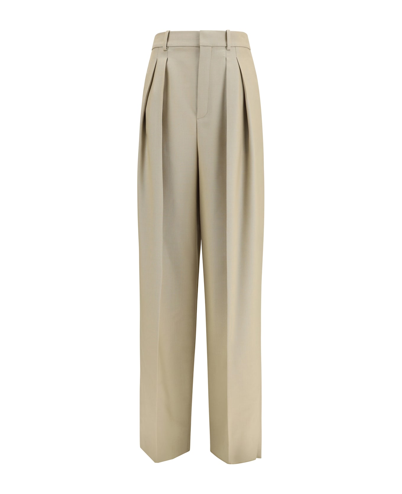 The tailored wool and silk canvas pants by saint laurent feature a sophisticated design and impeccable construction. crafted from certified wool with silk canvas, they are defined by a high waist and wide leg that enhances the silhouette. the style includes double front pleats and a central crease, adding structure and refinement. a concealed front hook and zip fastening keeps the design clean, while two hidden side pockets and two rear welt pockets complete the piece. belt loops at the waist provide a practical finishing touch.