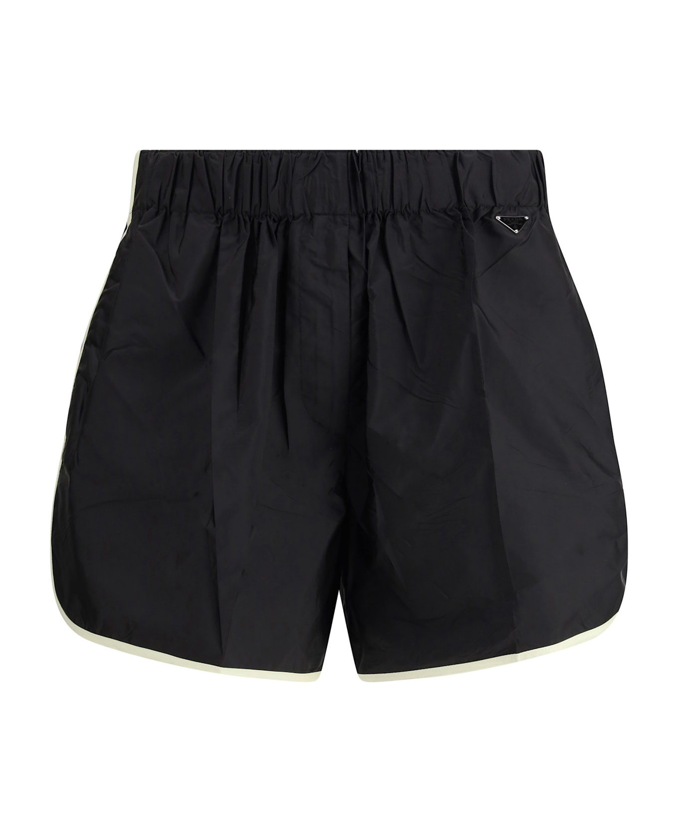 The lightweight re-nylon shorts by prada feature a sporty, functional design crafted from regenerated nylon made from recycled ocean plastics. the oversized silhouette is shaped by an elasticated waistband with an adjustable drawstring, while the side detail with an oblique cut adds a dynamic touch. the unlined construction is finished with a hem and topstitching and completed with the signature enameled metal triangle. Composition: 100% % Recycled Polyamide