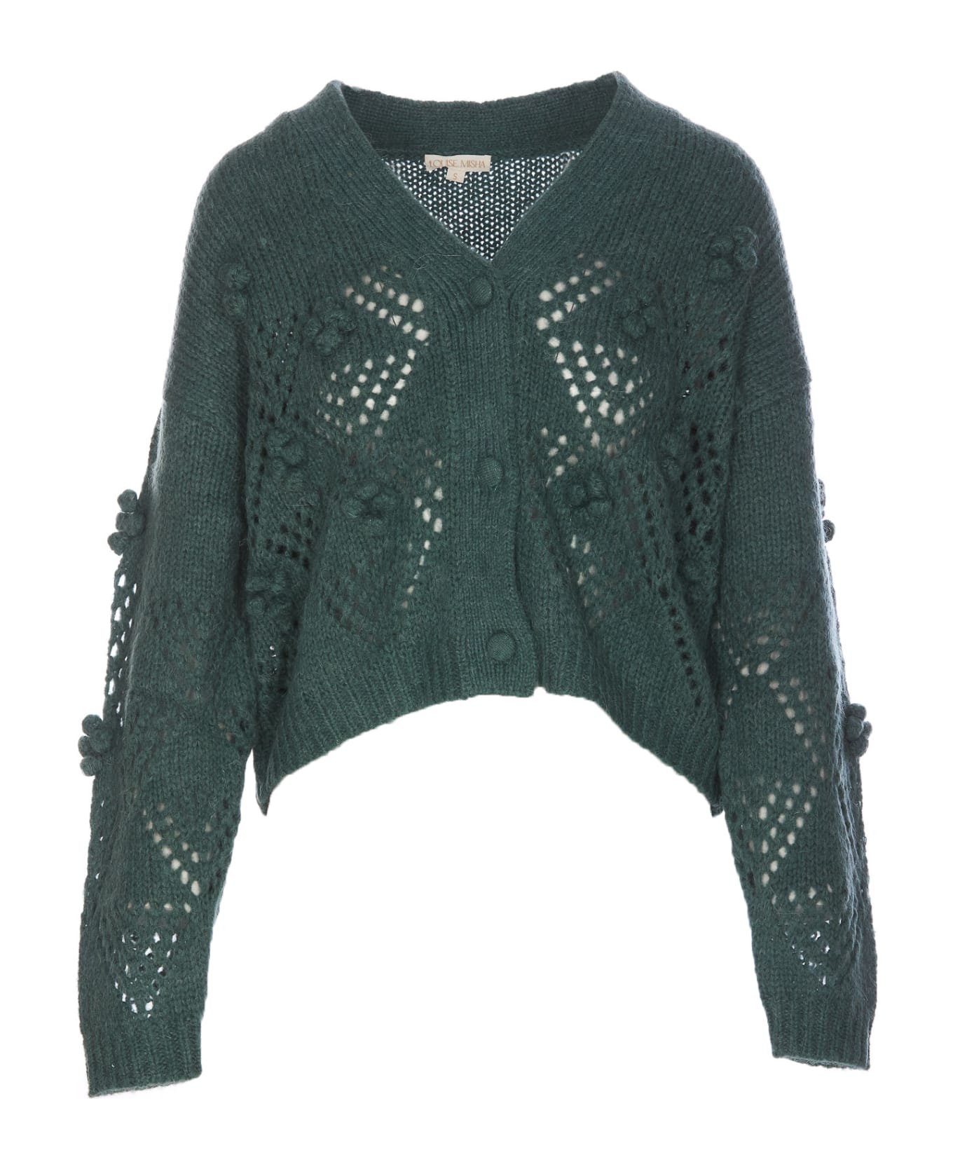 Louisa Misha green knitted cardigan, V-neck, long sleeves, details
