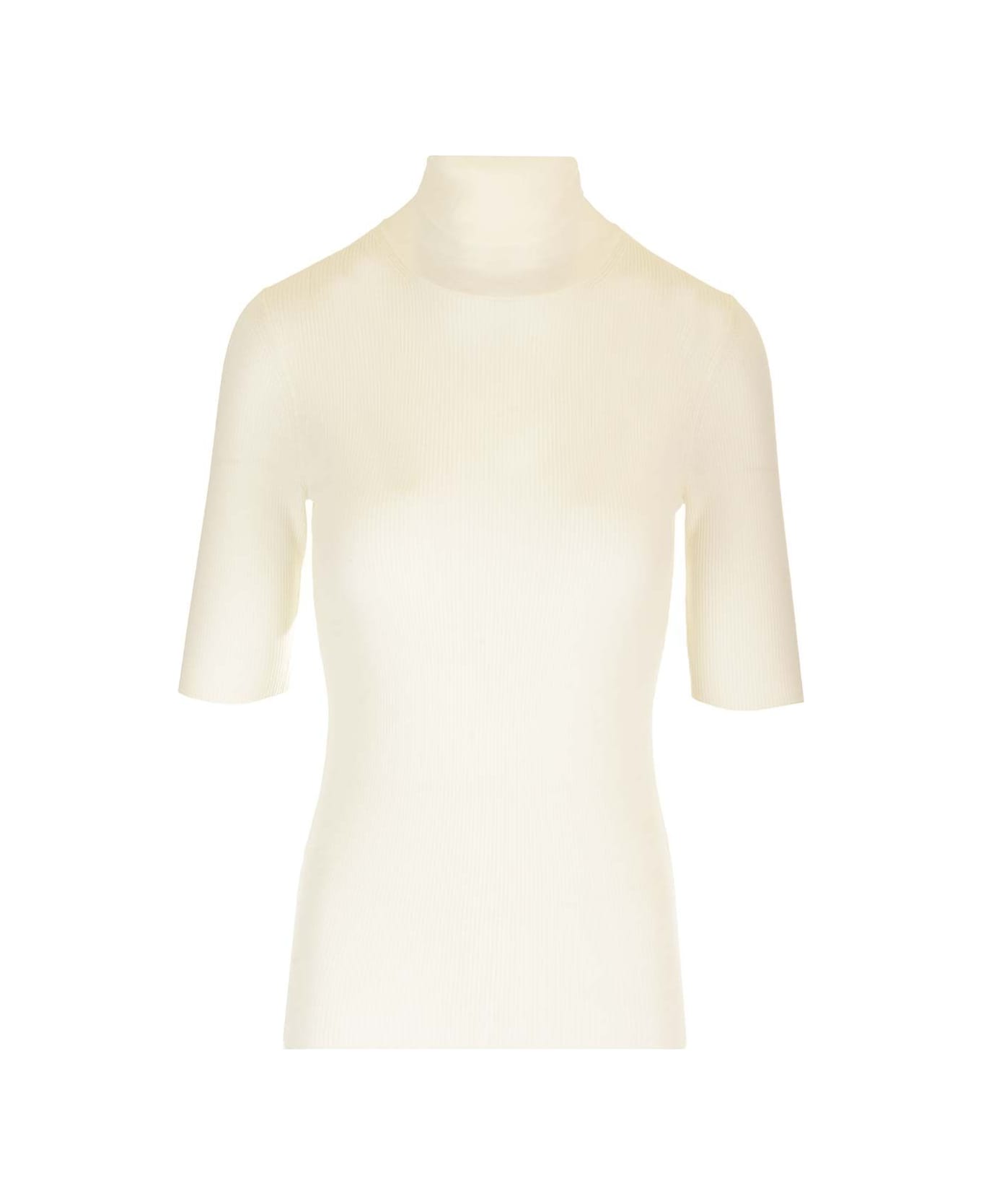 Wool sweater by Theory made of ribbed knit, fitted cut, turtleneck, short sleeves.