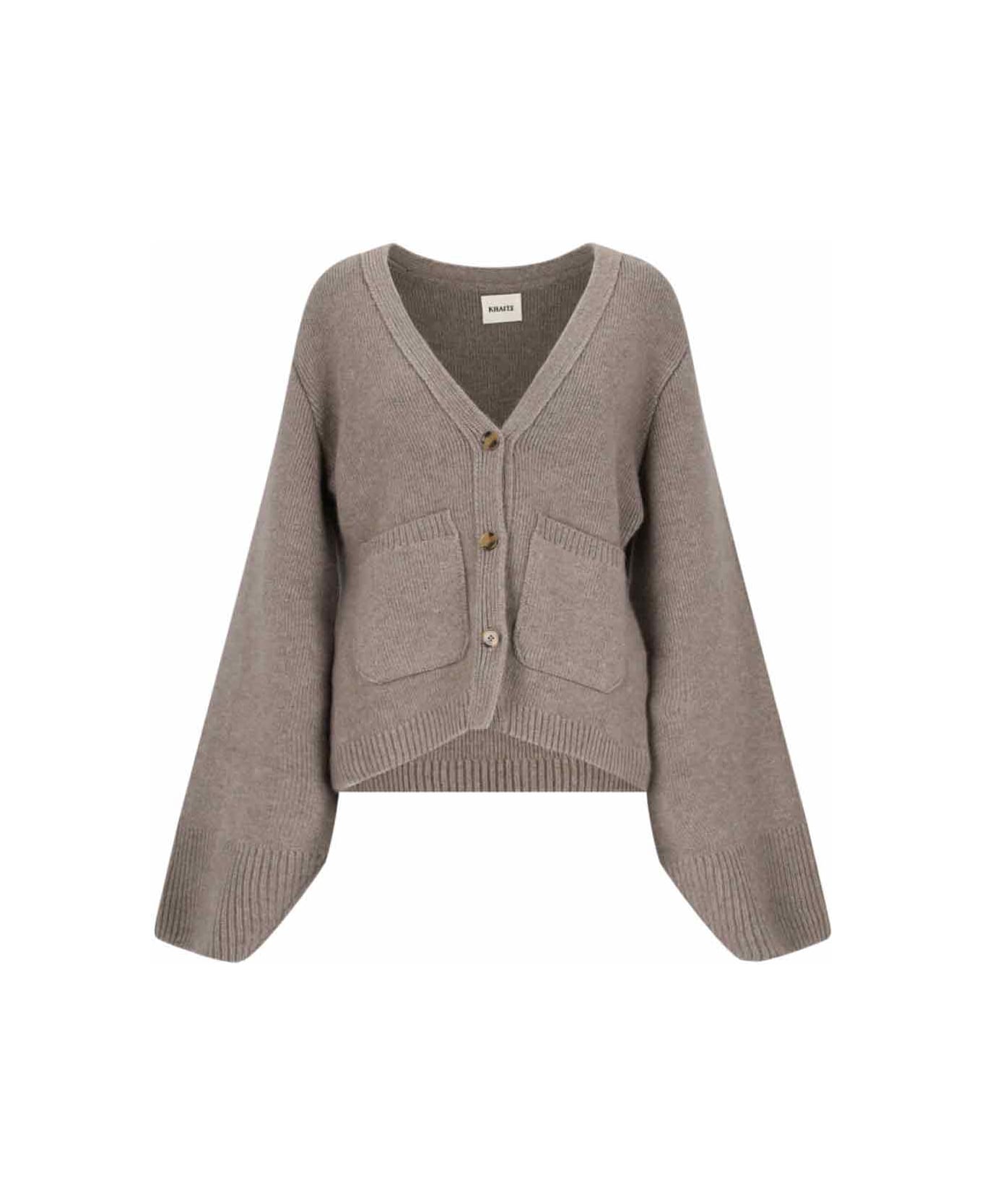 Khaite 'The Scarlet' beige cashmere cardigan with V-neck, wide sleeves, button closure, ribbed trim, two front patch pockets, straight hem. Composition: 100% Cashmere