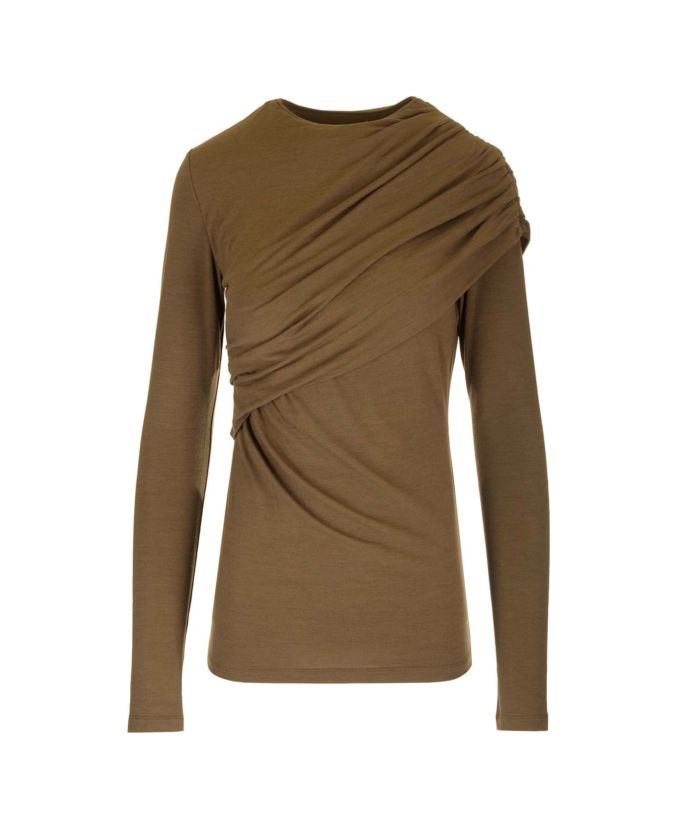 "Asna" top in liquorice wool jersey from Isabel Marant, with diagonal draping and long sleeves. Composition: