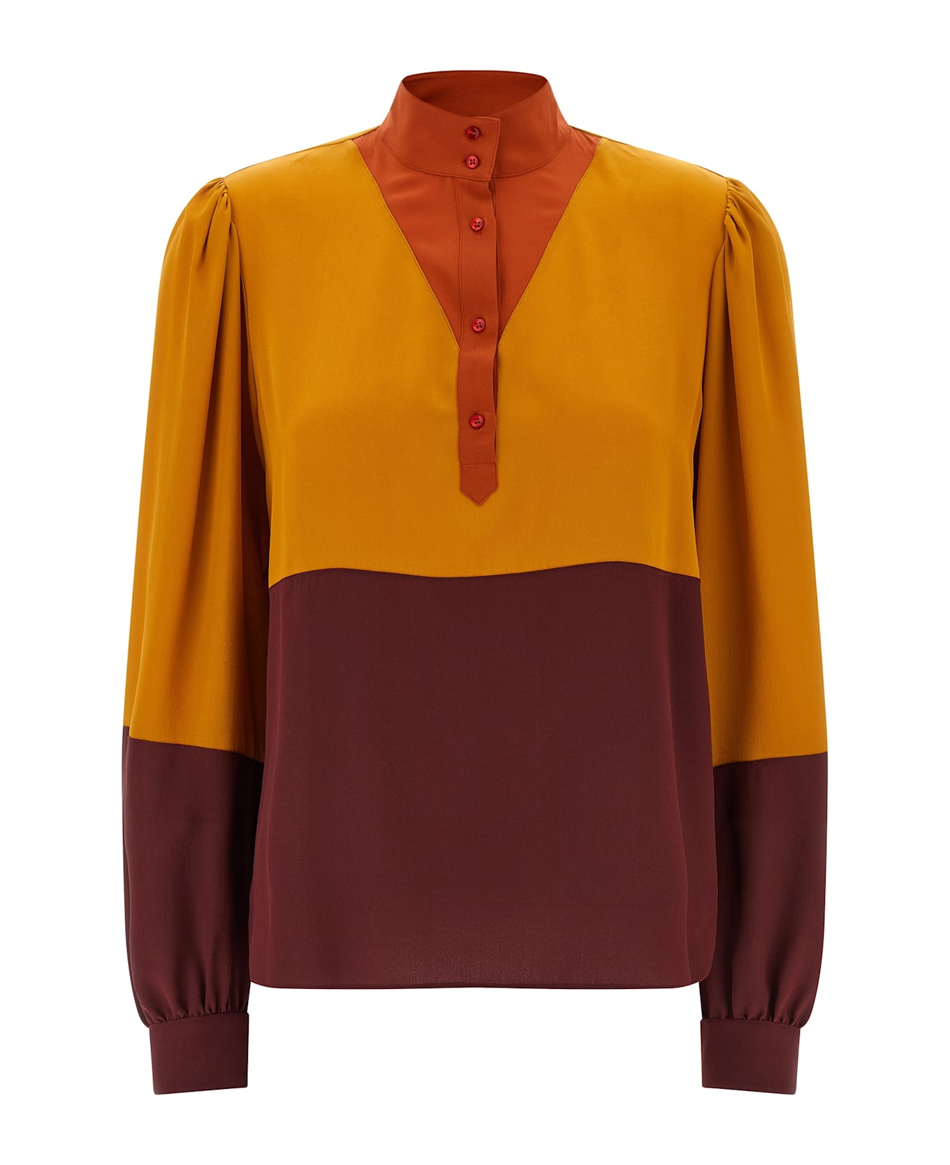 Color-block silk blouse, high neck, front button closure, long sleeves with curled shoulder and one-button blunt cuffs, rounded hem. Composition: 100% silk
