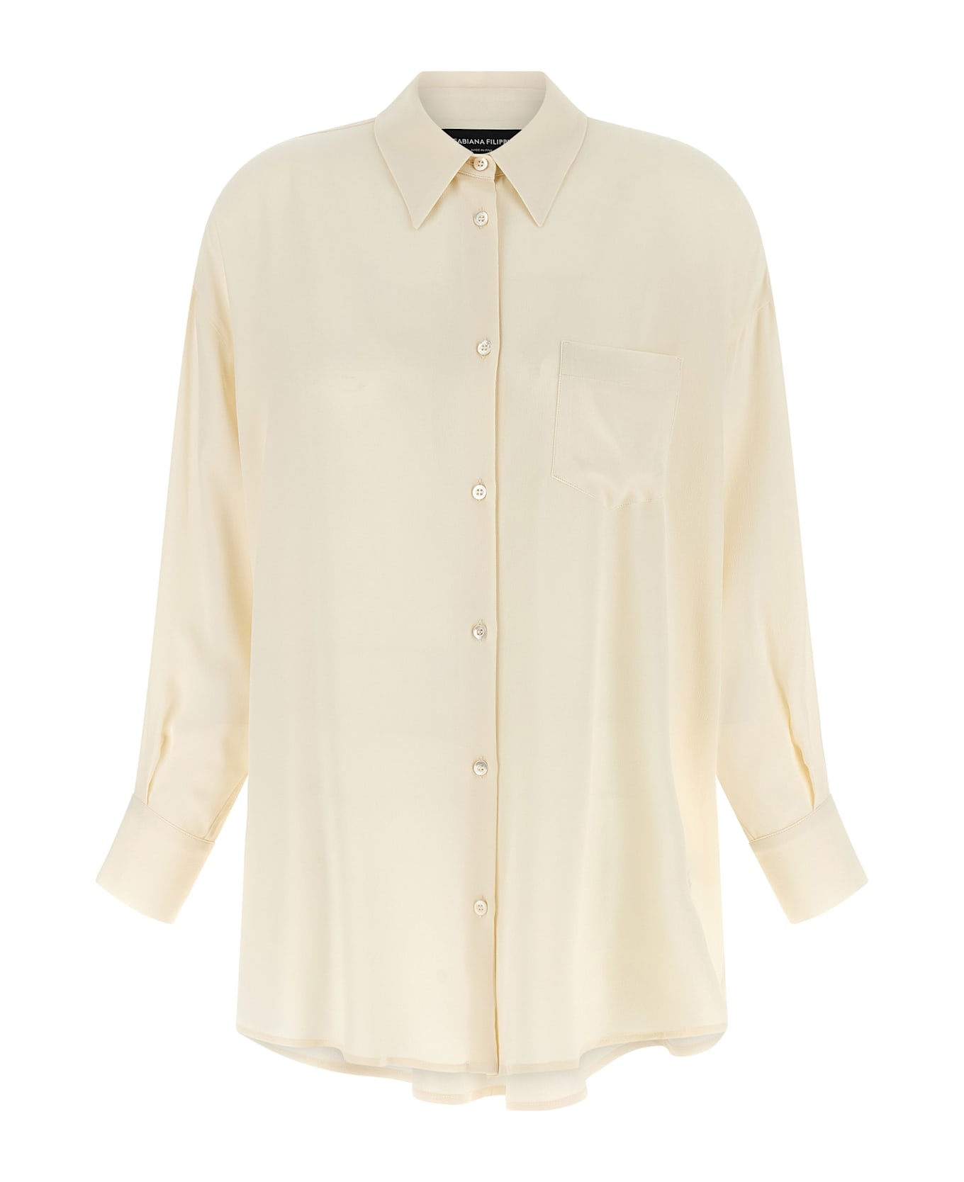 Fluid silk blend shirt, chest pocket, front button closure, long cuffed sleeves, tulle insert and diamond thread, and pointed collar. Composition: 68% acetate, 32% silk