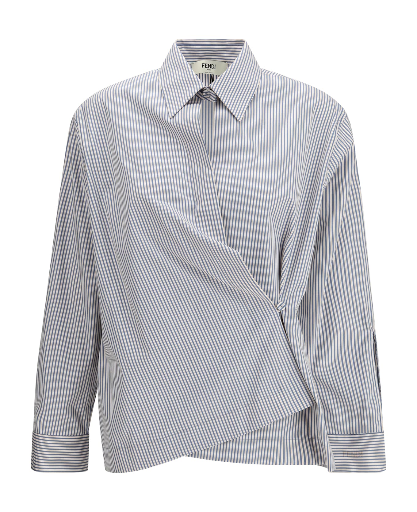 The striped shirt by fendi features a long-sleeved, cross-over silhouette that creates a draped effect at the side, enhanced by an asymmetric closure with a small lateral button. a classic shirt collar meets the high buttoned cuff, while a refined cut-out detail highlights the décolleté with subtle sophistication. crafted with a striped pattern and finished with the contrasting fendi roma embroidery on the left cuff, it embodies the maison s elegance with a modern, distinctive twist.