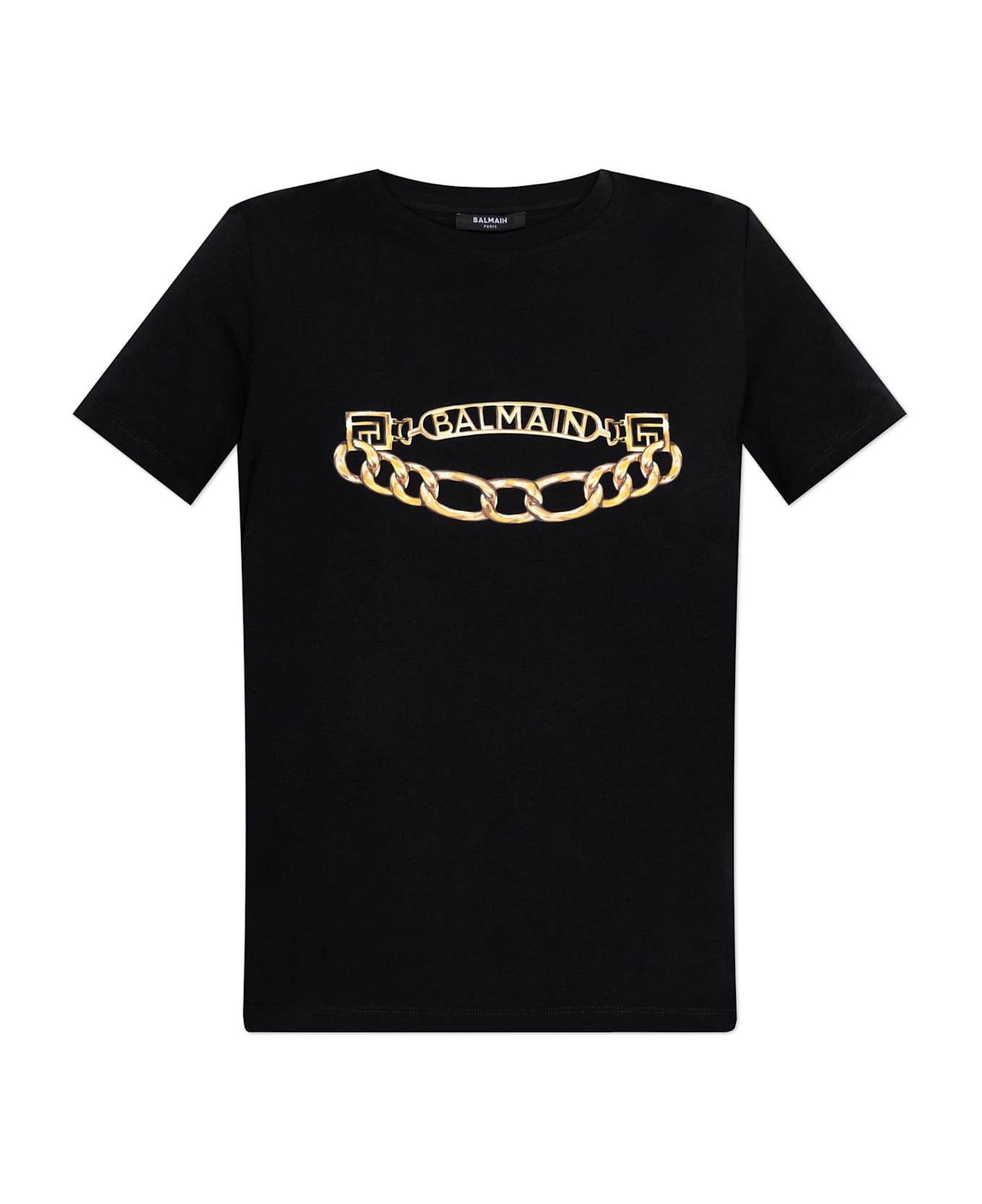 Immerse yourself in sophistication with this Balmain Printed T-Shirt, a refined essential from one of France's most illustrious fashion houses. Crafted from luxuriously soft black cotton, the classic, gently tailored silhouette features short sleeves and a timeless crew neckline, beautifully flattering the female figure. The commanding feature is a bold, gold-toned print: an exquisitely stylized chain encircling the iconic BALMAIN insignia. This dazzling emblem, inspired by the house's tradition of enhancing feminine contours and embracing contemporary rock allure, lends an unmistakable air of exclusivity and Parisian glamour. Elevate any ensemble with this emblematic tribute to Balmain's youthful yet sophisticated aesthetic ideal for aficionados of expressive, designer statement pieces. Why choose this product? Crafted from premium, exceptionally soft cotton Features an exclusive gold designer motif and logo Effortlessly flatters the feminine silhouette Represents the prestige of Balmain's historic design legacy Perfect for making a bold, luxurious statement in any setting
