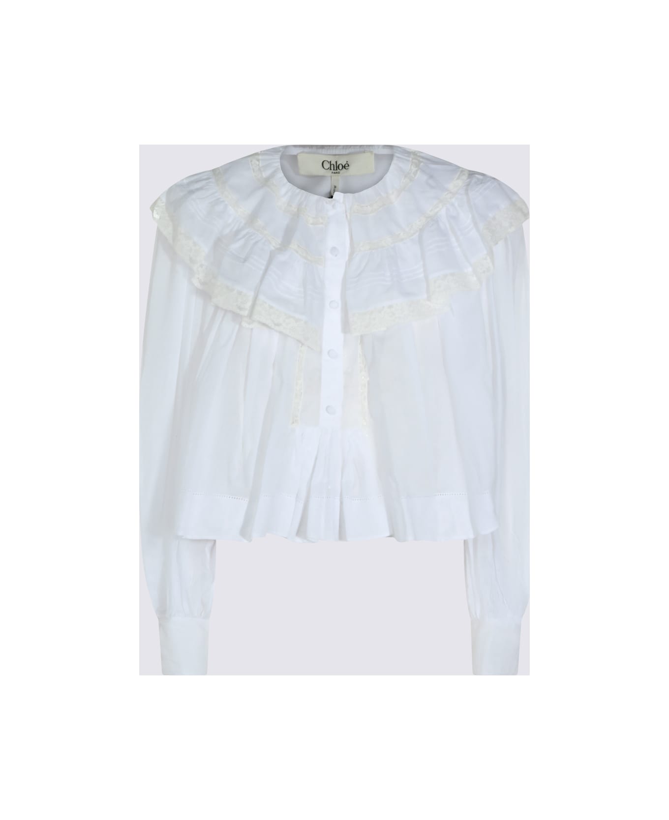 White silk top from Chloé featuring round collar, long sleeves, ruffles, buttoned cuffs, lace details and cropped. Composition: _, 100% Silk