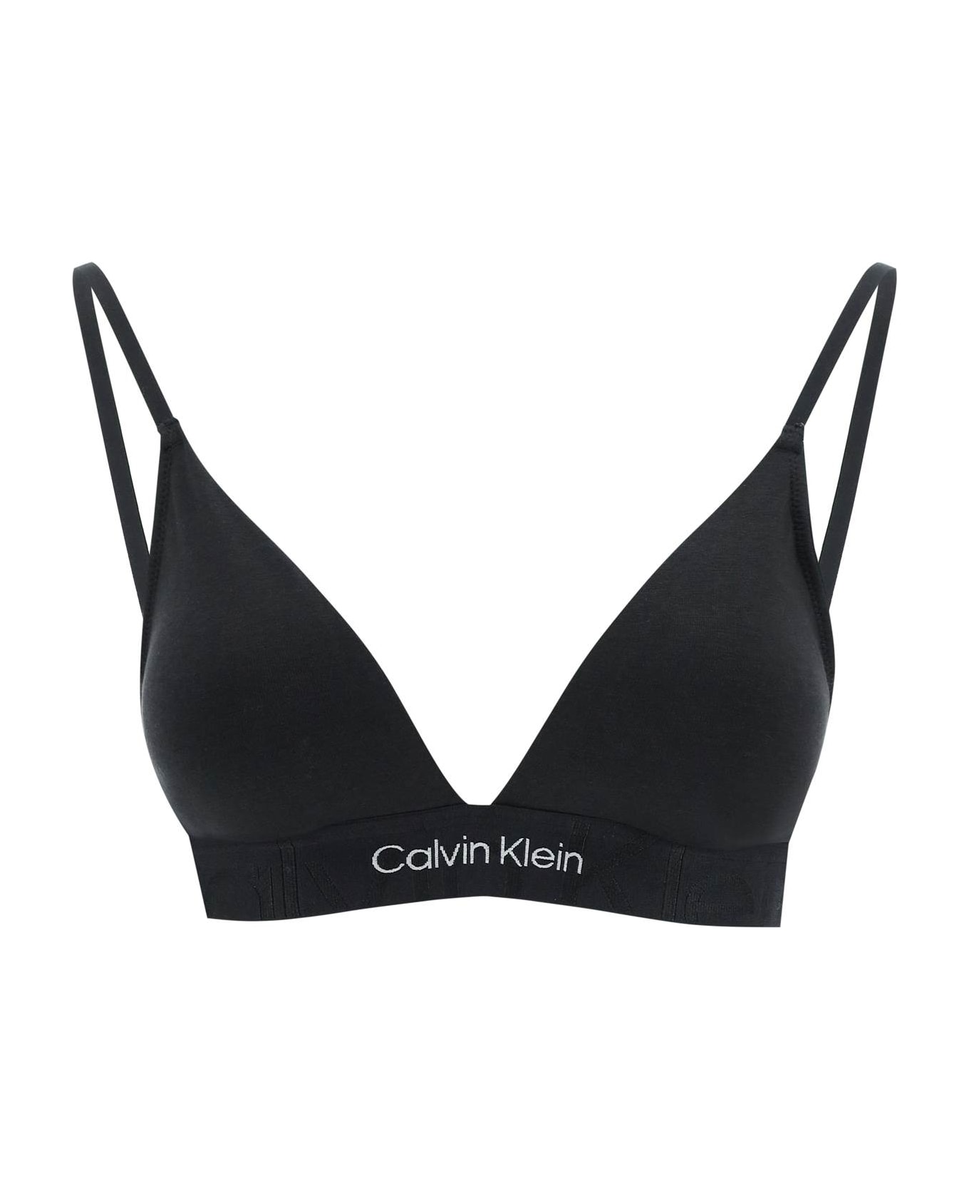 Embossed Icon triangle bra by Calvin Klein in cotton-blend stretch jersey featuring cups with light removable padding, adjustable straps, adjustable hook-and-eye back closure and jacquard-logo elastic band.