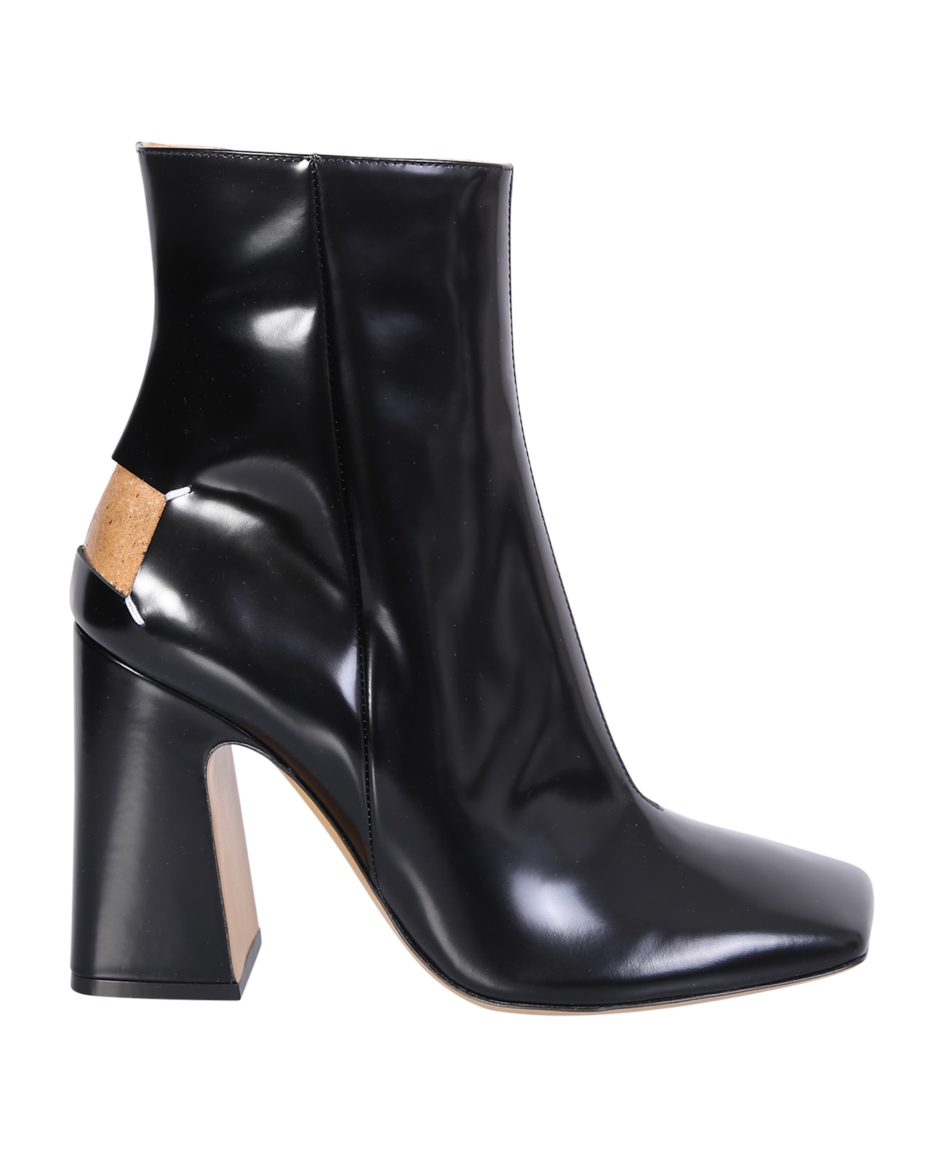 Exclusive Maison Margiela ankle boots crafted in fine black leather, adorned with the signature four stitches detail; a sharp silhouette balanced with a modern sculptural heel.