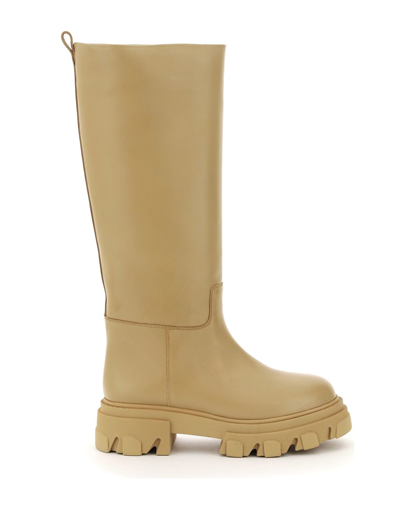 Tubular leather combat boots by Gia x Pernille Teisbaek with back loop, leather interior, oversized rubber lug sole.