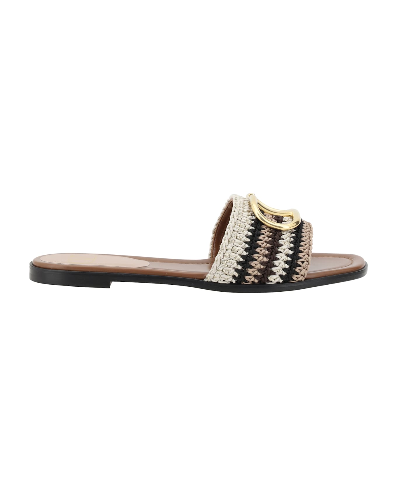 Valentino garavani's sandals feature a squared toe that gives them a bold, modern design. the iconic vlogo plaque is applied to the front strap, adding a distinctive touch of the brand. the multicolored crochet-effect design enriches the shoe with a sophisticated and original pattern. the logoed insole emphasizes the brand identity, while the flat sole ensures comfort and practicality. an elegant and contemporary model, perfect for a casual yet trendy look.