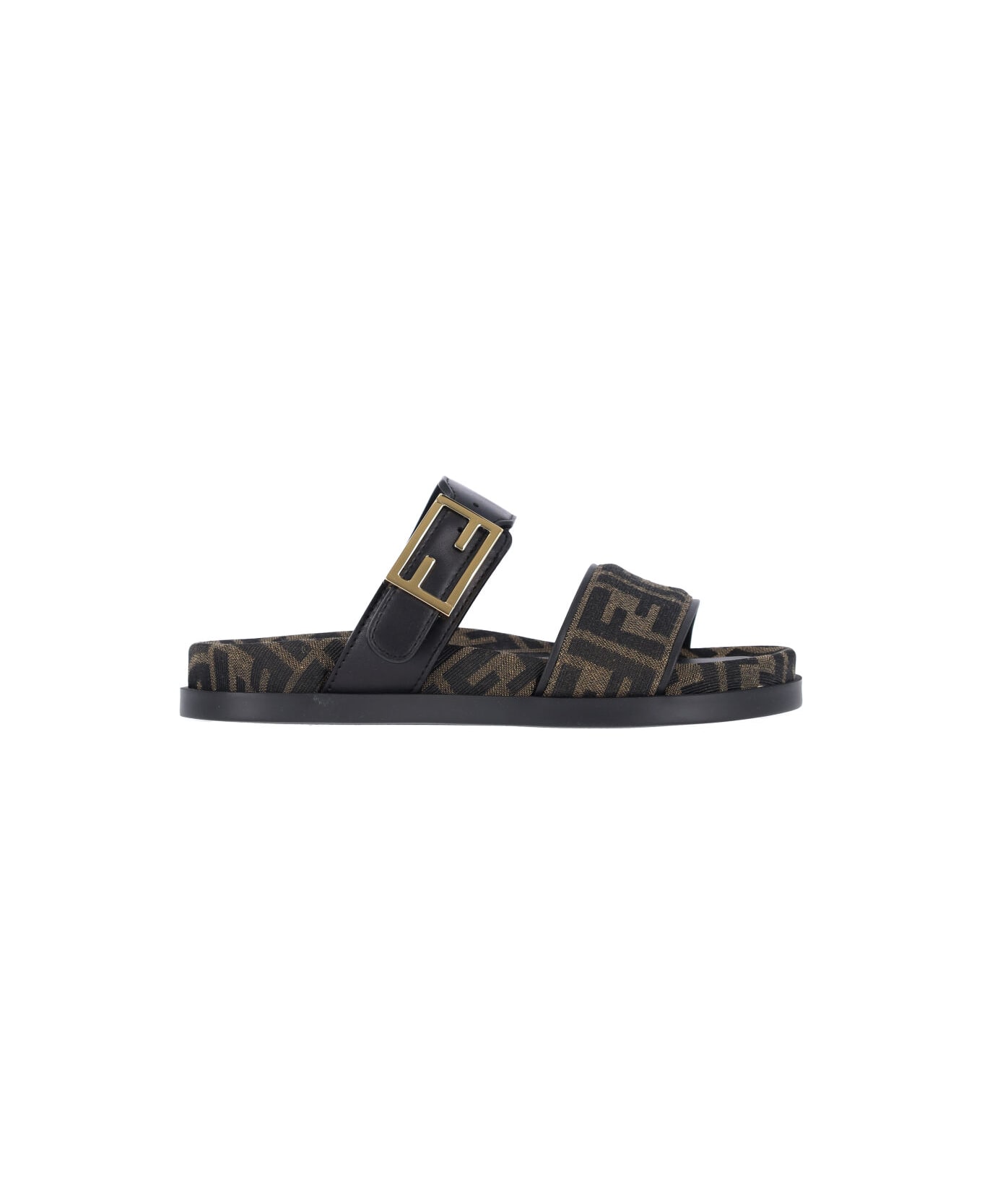 Fendi "Feel" slide sandals in brown fabric and lamb nappa leather, round toe, top band, embossed "FF" logo detail, adjustable strap, gold metal "FF" logo buckle detail, slip-on fit, rubber sole.